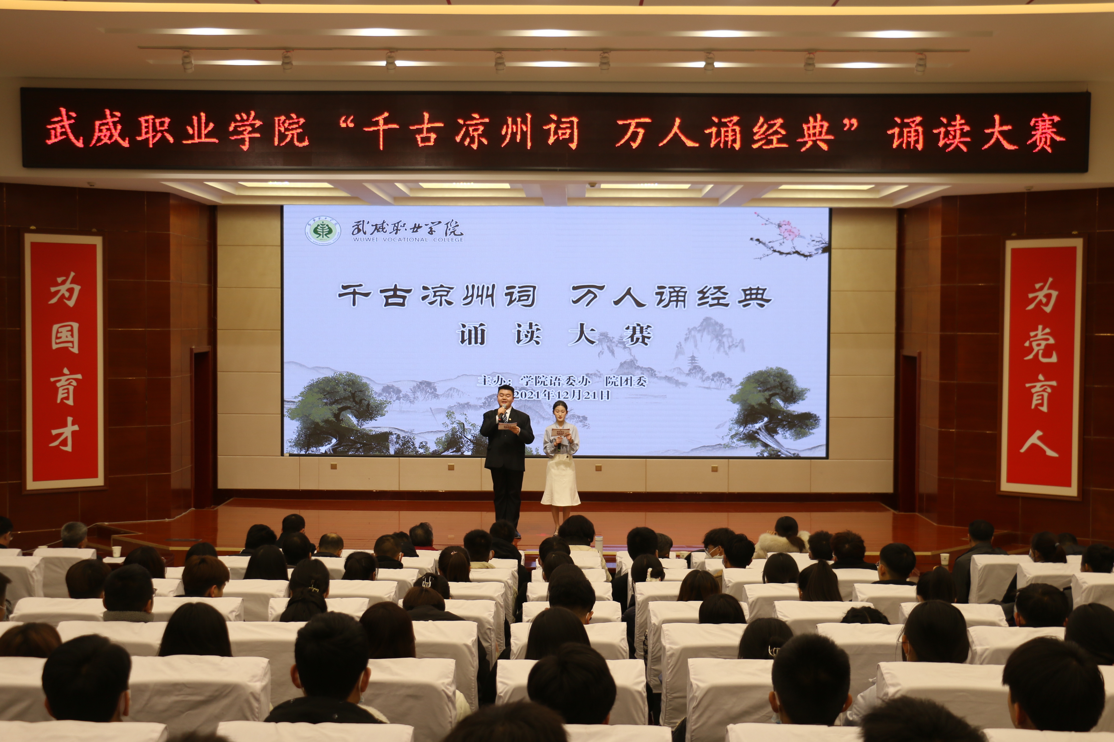 為深化黨史學(xué)習(xí)教育,推進(jìn)“雙高計劃”建設(shè)任務(wù),弘揚涼州文化,傳承絲路精神,助推全國文明城市創(chuàng)建,營造書香校園氛圍,12月21日晚,學(xué)院“千古涼州詞 萬人誦經(jīng)典”誦讀大賽在菁英廳舉辦,學(xué)院黨委書記、院長趙明,黨委委員、副院長張開禮,黨委委員、副院長王守云出席活動,各分團委書記及學(xué)生代表250余人觀看比賽。