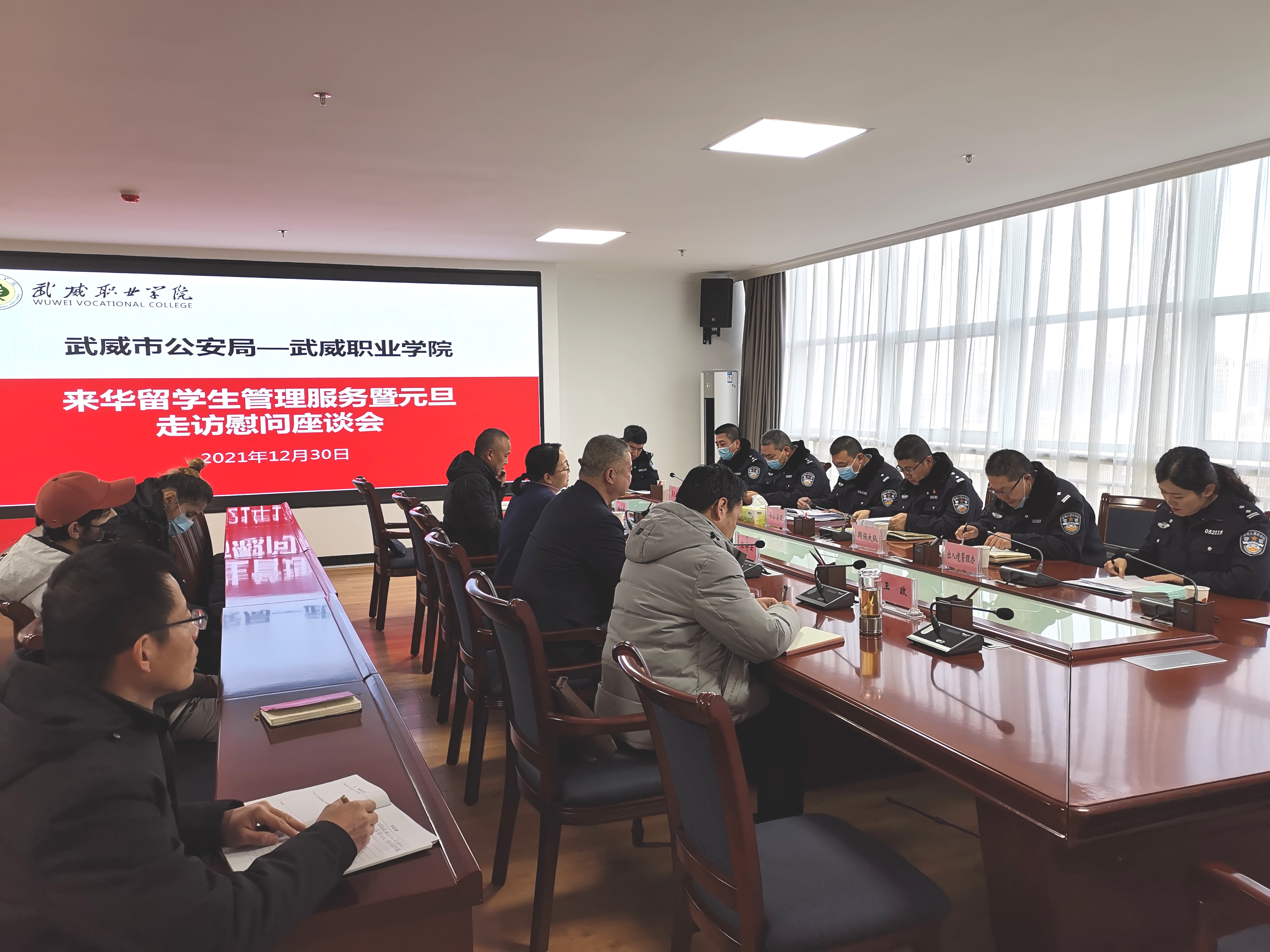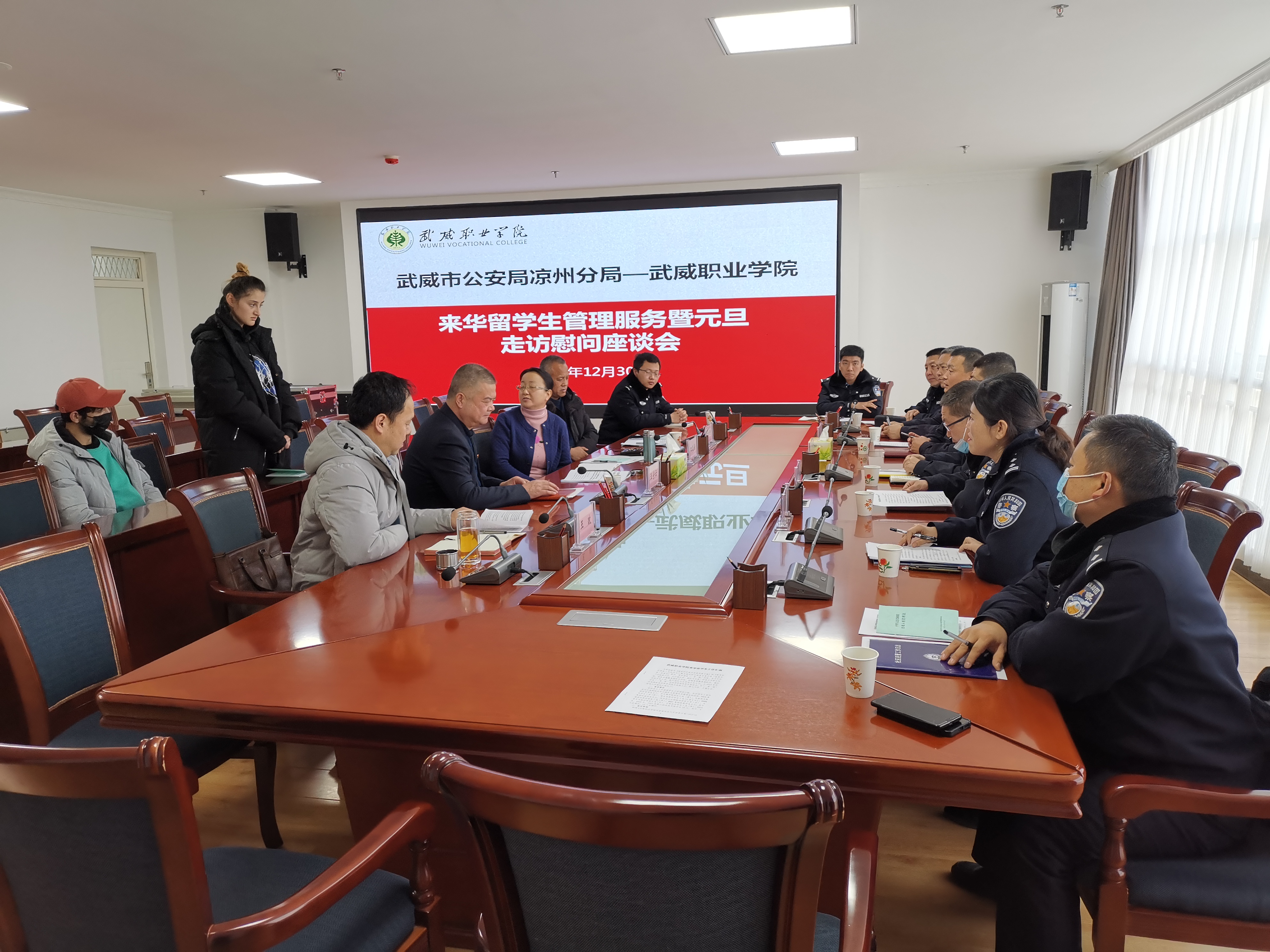12月30日上午,市公安局出入境管理科、非政府組織管理辦公室,市公安局涼州分局國安大隊(duì)、反恐大隊(duì)、出入境管理辦公室、涼州分局西關(guān)街派出所一行十一人到訪學(xué)院,開展來華留學(xué)生管理服務(wù)暨元旦走訪慰問活動(dòng)。黨委委員、副院長田迎春、王守云出席活動(dòng)。國際合作與交流處處長潘從民、保衛(wèi)處處長王政及相關(guān)人員,2019級(jí)、2021級(jí)在華留學(xué)生參加活動(dòng)。田迎春主持活動(dòng)。