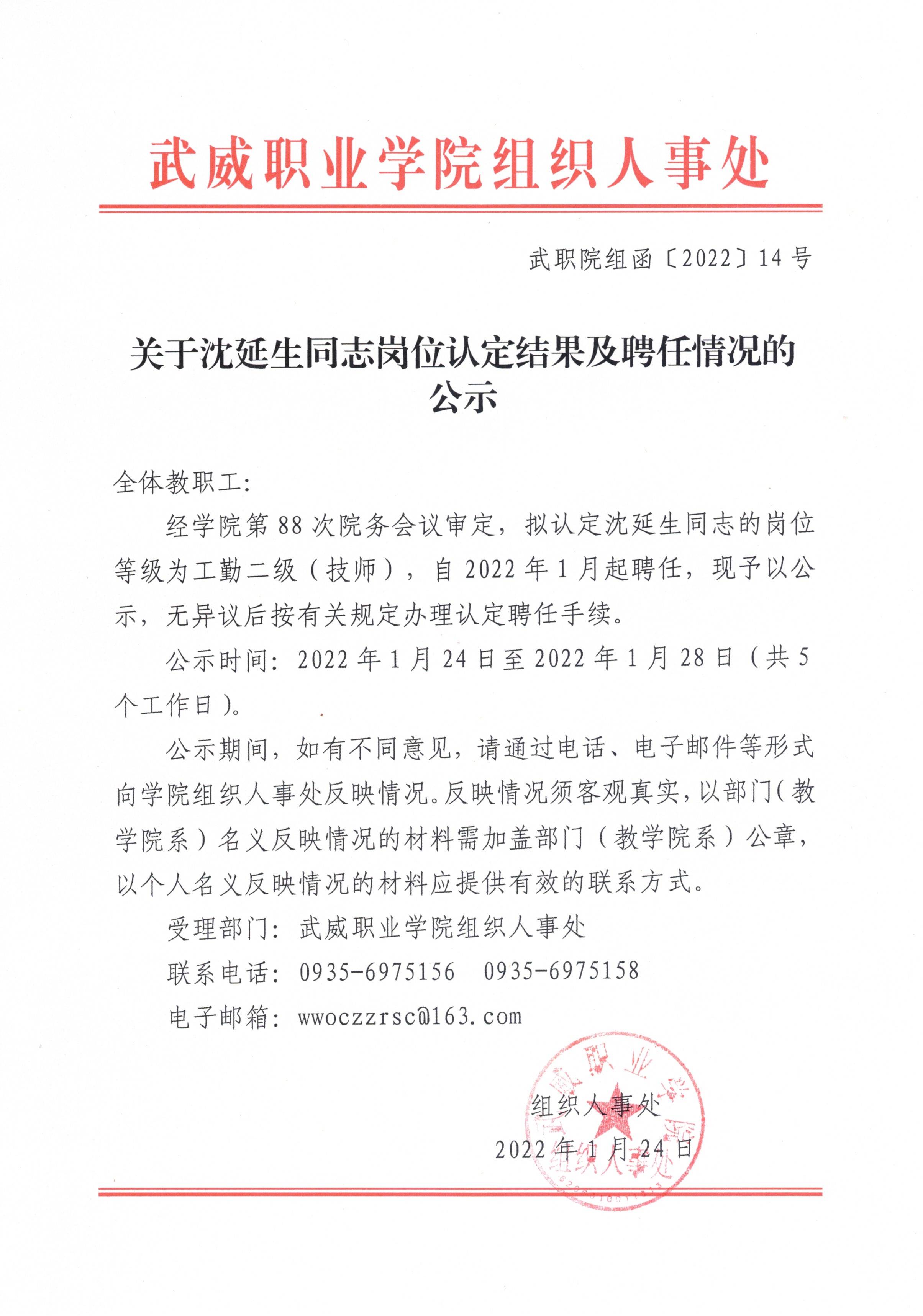 關于沈延生同志崗位認定結果及聘任情況的公示