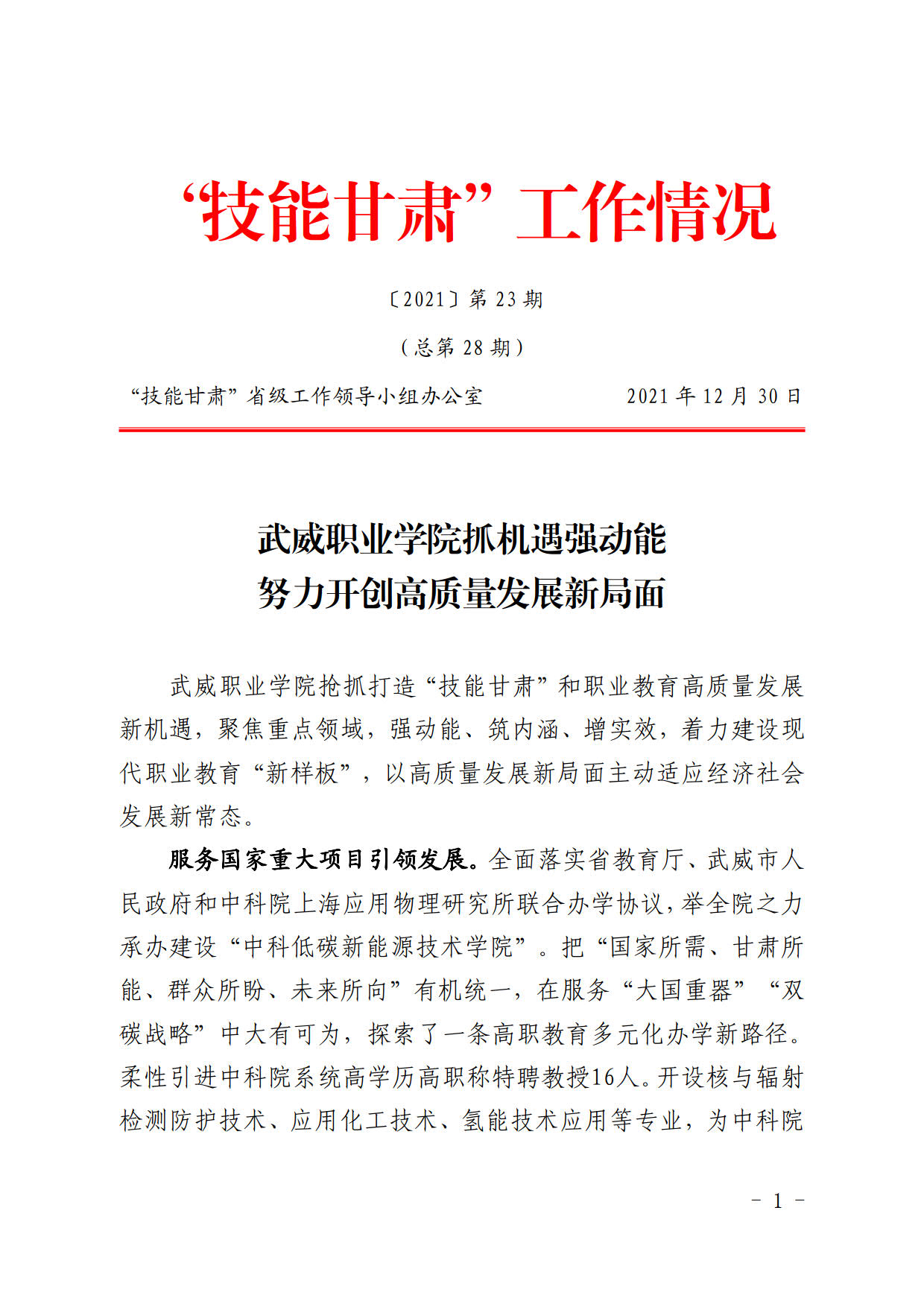 技能甘肅工作情況第28期:武威職業(yè)學院抓機遇強動能努力實現(xiàn)高質量發(fā)展