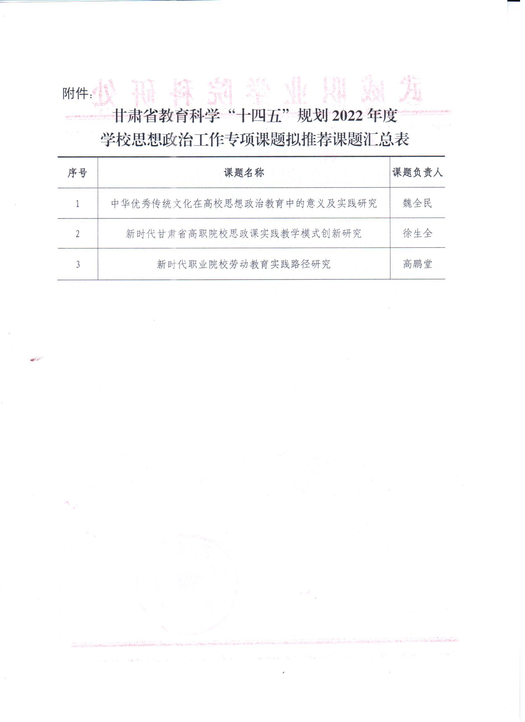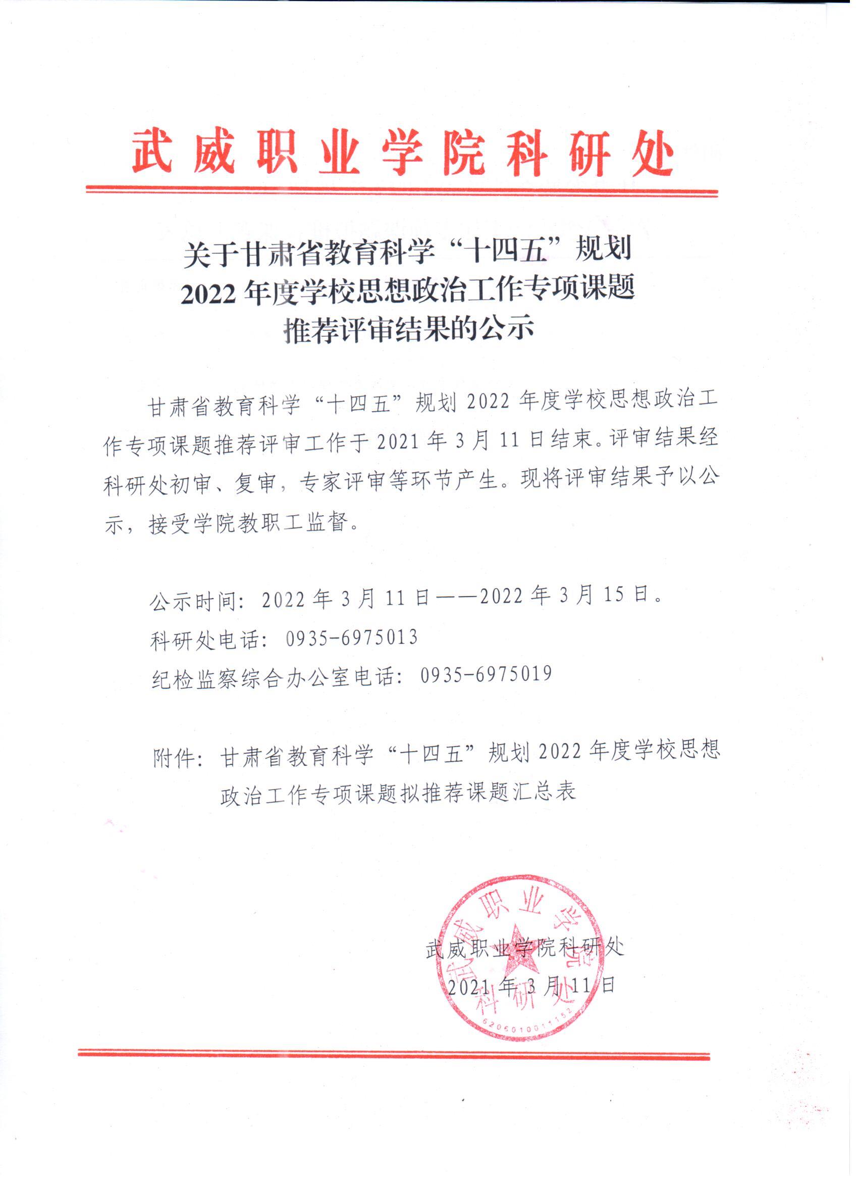 關(guān)于甘肅省教育科學(xué)“十四五”規(guī)劃2022年度學(xué)校思想政治工作專項(xiàng)課題推薦評(píng)審結(jié)果的公示