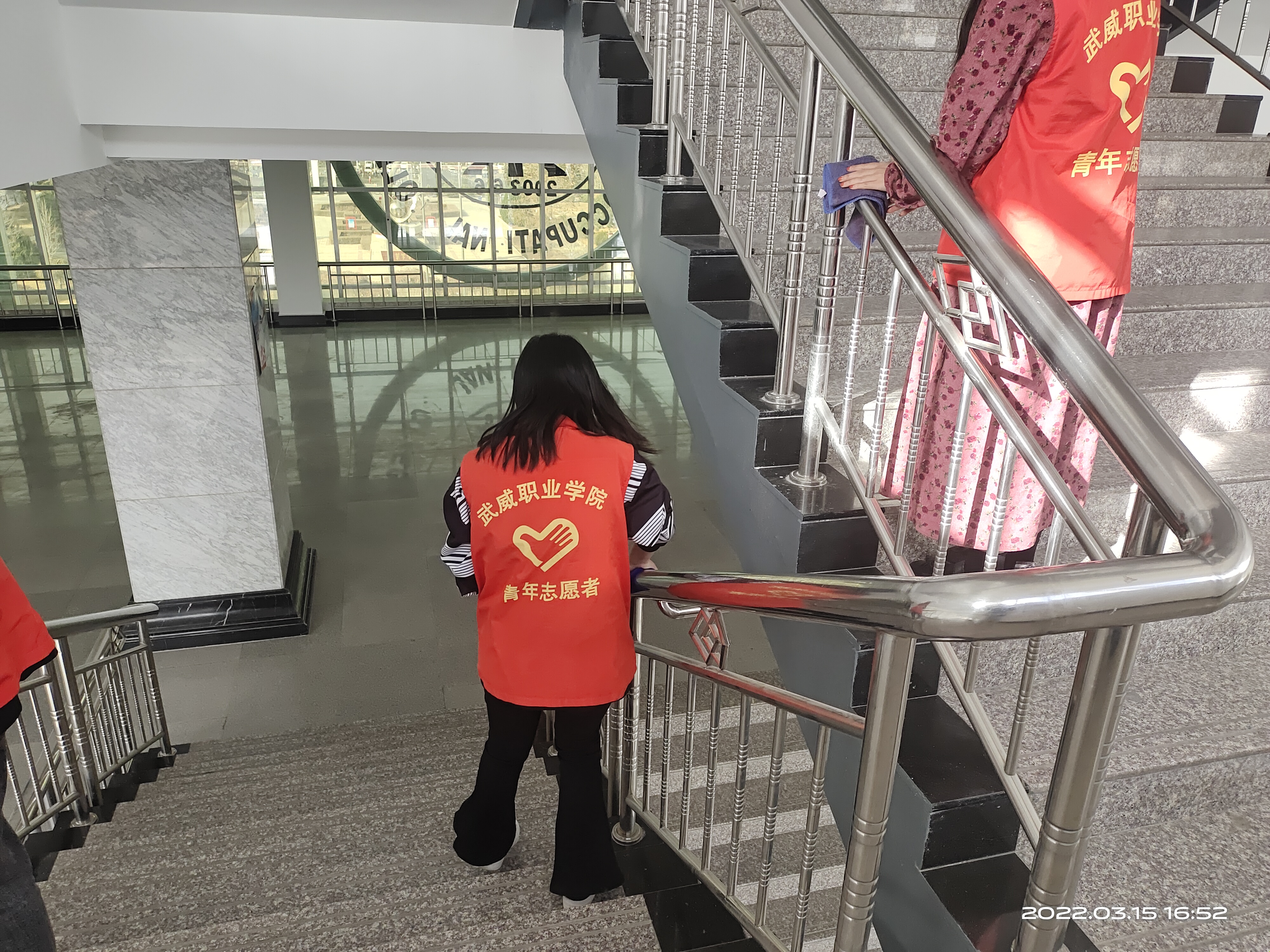 青年志愿者們不僅僅只是一個(gè)名義,他們不怕臟,不怕累,穿梭在校園各個(gè)角落,他們拿著掃帚、簸箕打掃衛(wèi)生死角,撿煙頭,還有一批在教學(xué)樓內(nèi)打掃公共教室的,有的在收拾垃圾,有的在擦黑板。教學(xué)樓門口也有他們的身影,在烈日炎炎下擦拭著玻璃,他們這種勇于參與志愿者活動(dòng)、不怕苦、不怕累的精神值得同學(xué)們學(xué)習(xí)。