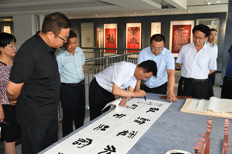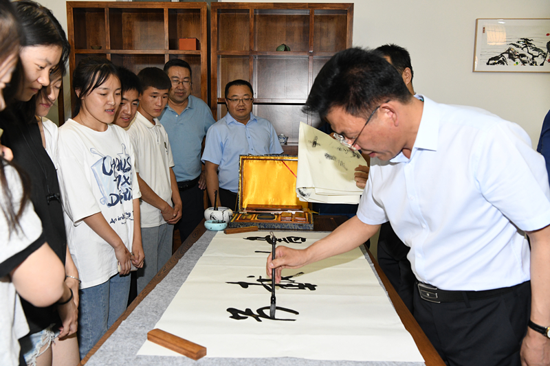 捐贈(zèng)儀式前,齊澤山一行參觀了學(xué)校紅色文化藝術(shù)館、學(xué)生發(fā)展中心、雙創(chuàng)中心、藝術(shù)與教育學(xué)院書法實(shí)訓(xùn)室等場(chǎng)地,并現(xiàn)場(chǎng)指導(dǎo)學(xué)校志通書法協(xié)會(huì)學(xué)生習(xí)作。