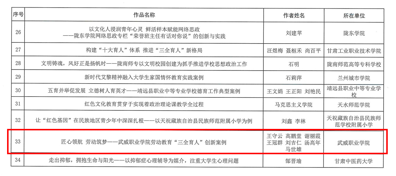 近日,2022年全省學校思想政治教育工作成果征集活動評選結果公布,武威職業(yè)學院喜獲佳績,兩件作品獲獎。其中,王守云、高鵬堂、謝麗霞、王冠群、劉吉仁、湯高年、馬世雄老師的《匠心領航 勞動筑夢—武威職業(yè)學院勞動教育“三全育人”創(chuàng)新案例》獲思想政治典型案例三等獎;張保海、馮文娟、謝麗霞老師的《基于“診改”的思政教育質量評價體系構建研究》獲思想政治論文三等獎。