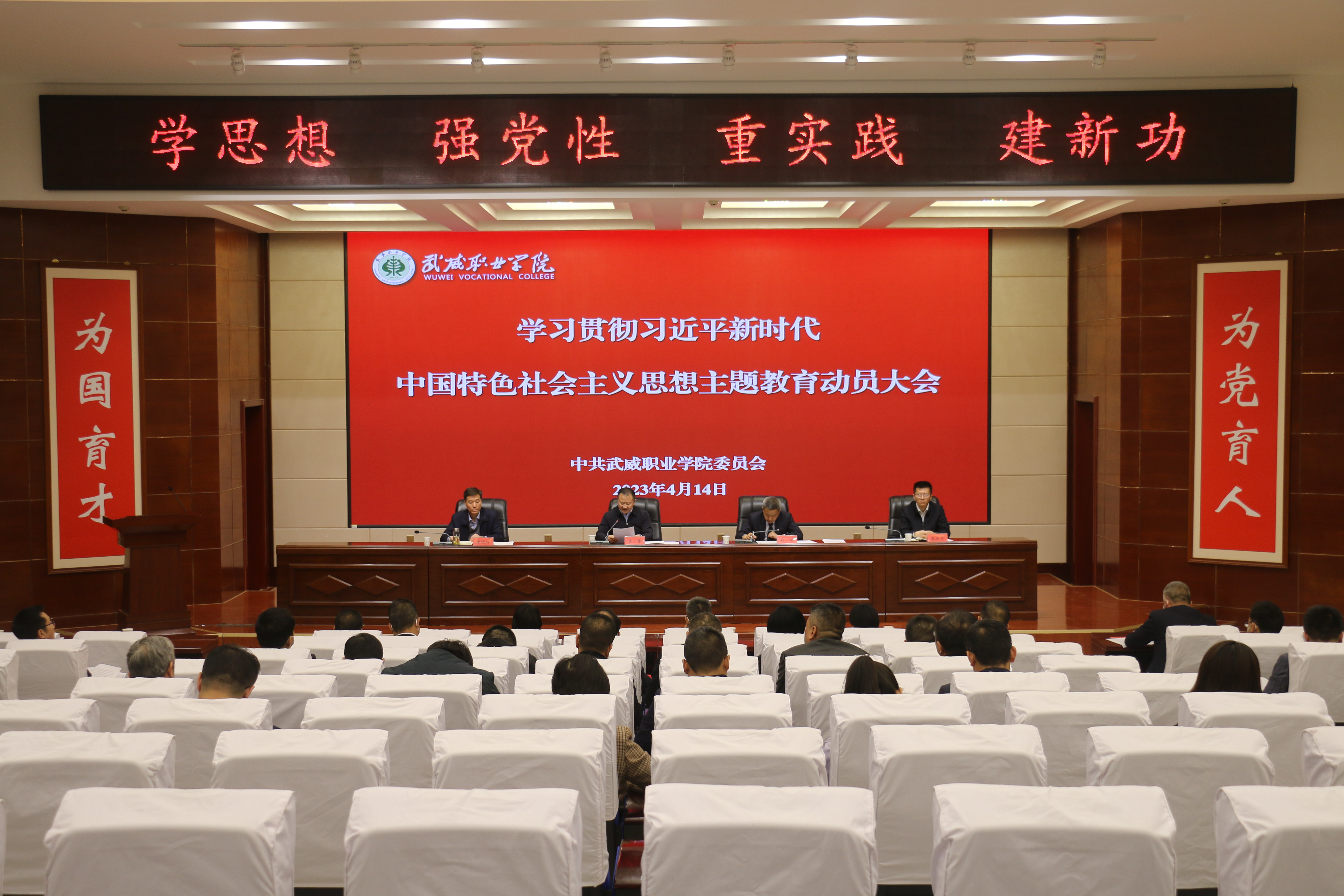 4月14日下午,學校召開學習貫徹習近平新時代中國特色社會主義思想主題教育動員部署會議。省委第十巡回指導組副組長、省景泰川電力提灌水資源利用中心黨委委員、副主任廖贊到會指導并講話。學校黨委書記、校長、主題教育領導小組組長趙明主持會議,傳達中央主題教育工作會議精神和省委主題教育動員部署會議精神并作動員講話。