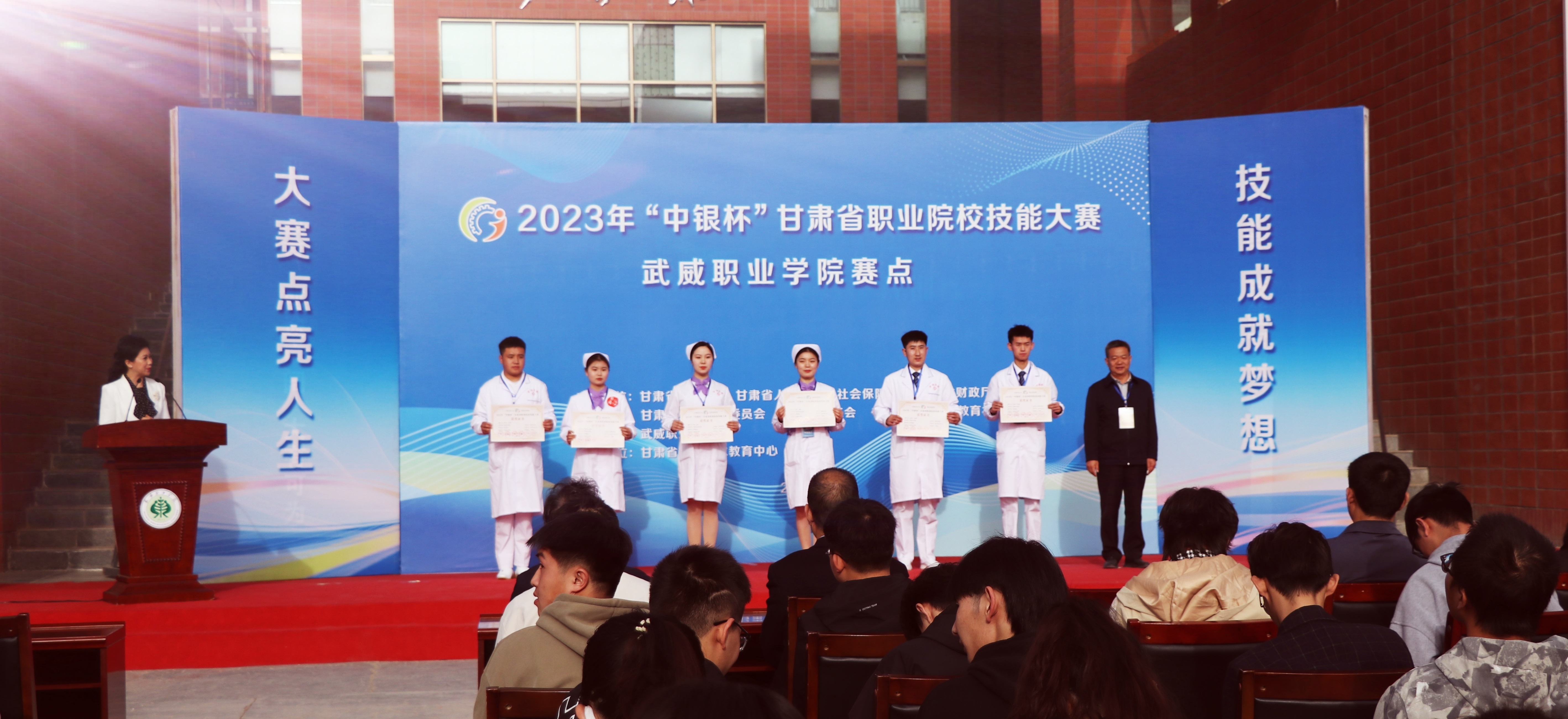 為全面貫徹落實省委辦公廳、省政府辦公廳《關(guān)于推動現(xiàn)代職業(yè)教育高質(zhì)量發(fā)展,加快“技能甘肅”建設的若干措施》,進一步推動打造“技能甘肅”工作,促進職業(yè)學校專業(yè)建設與教學改革,提高學生實踐動手能力和職業(yè)素養(yǎng),弘揚勞動光榮、技能寶貴、創(chuàng)造偉大的時代風尚,引領(lǐng)職業(yè)學校適應行業(yè)現(xiàn)狀及技術(shù)發(fā)展趨勢,檢驗教學成果,促進護理專業(yè)的教育教學改革。4月10日-4月12日,2023年“中銀杯”甘肅省職業(yè)院校技能大賽護理技能賽項在武威職業(yè)學院順利舉行。來自全省10所高職院校的25個團隊、50名學生和22名教師選手匯集武威職業(yè)學院賽場,共同譜寫護理人的工匠精神和大愛情懷。