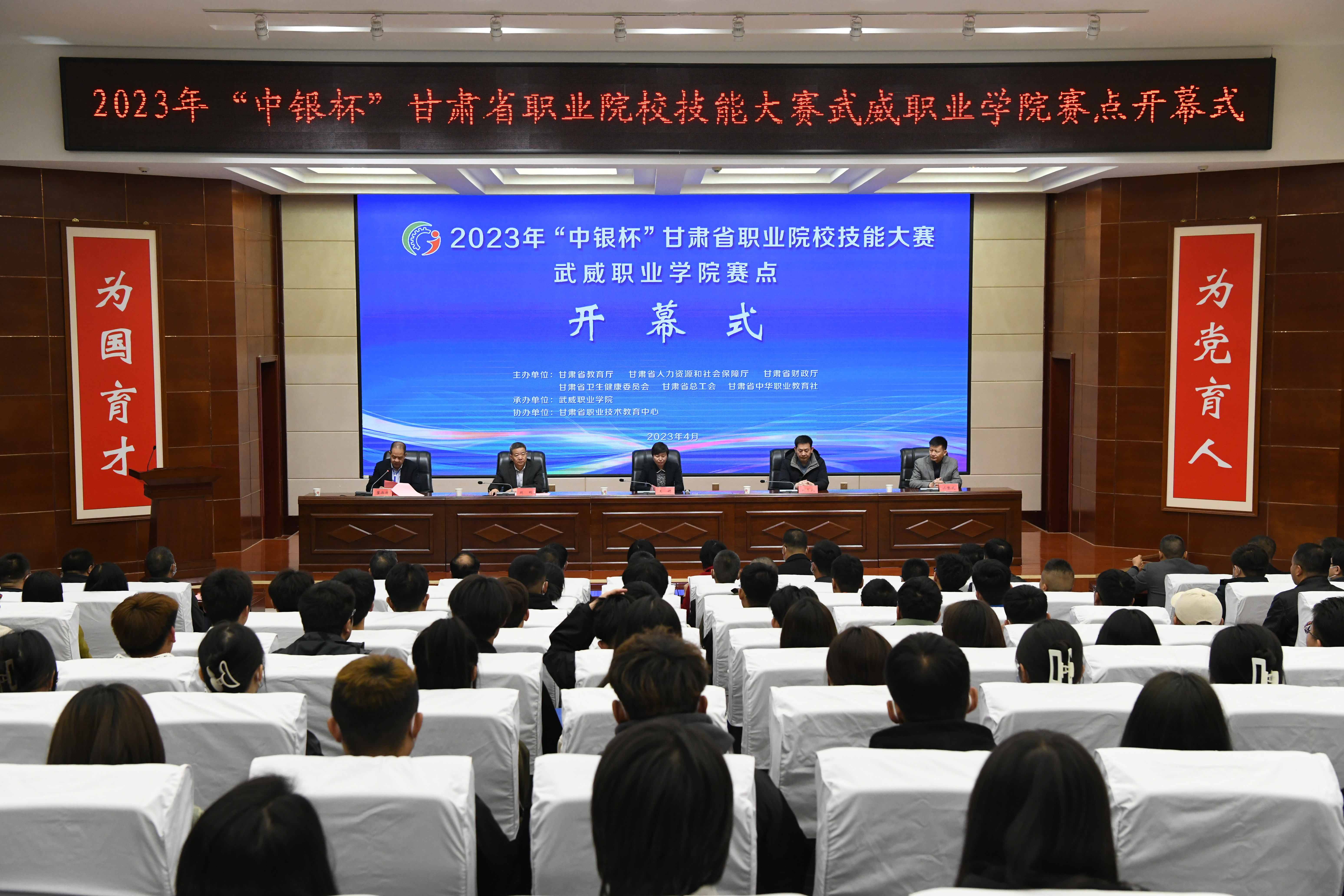 4月8日早上8:30,2023年“中銀杯”甘肅省職業(yè)院校技能大賽武威職業(yè)學(xué)院賽點(diǎn)開賽儀式在學(xué)校菁英廳舉行。全省職業(yè)院校技能大賽監(jiān)督員、賽點(diǎn)仲裁工作組組長,蘭州資源環(huán)境職業(yè)技術(shù)大學(xué)黨委委員、副校長謝軍武,全省職業(yè)院校技能大賽電子與信息大類首席專家、賽點(diǎn)仲裁工作組組員,酒泉職業(yè)技術(shù)學(xué)院新能源學(xué)院院長馮黎成,武威市教育局黨組書記、局長王娟,學(xué)校黨委書記、校長趙明出席開幕式。學(xué)校領(lǐng)導(dǎo)班子成員,各參賽學(xué)校領(lǐng)隊(duì)、參賽師生代表,裁判員代表,賽點(diǎn)組委會(huì)及各工作小組成員代表參加。開賽儀式由學(xué)校黨委副書記翟存祥主持。