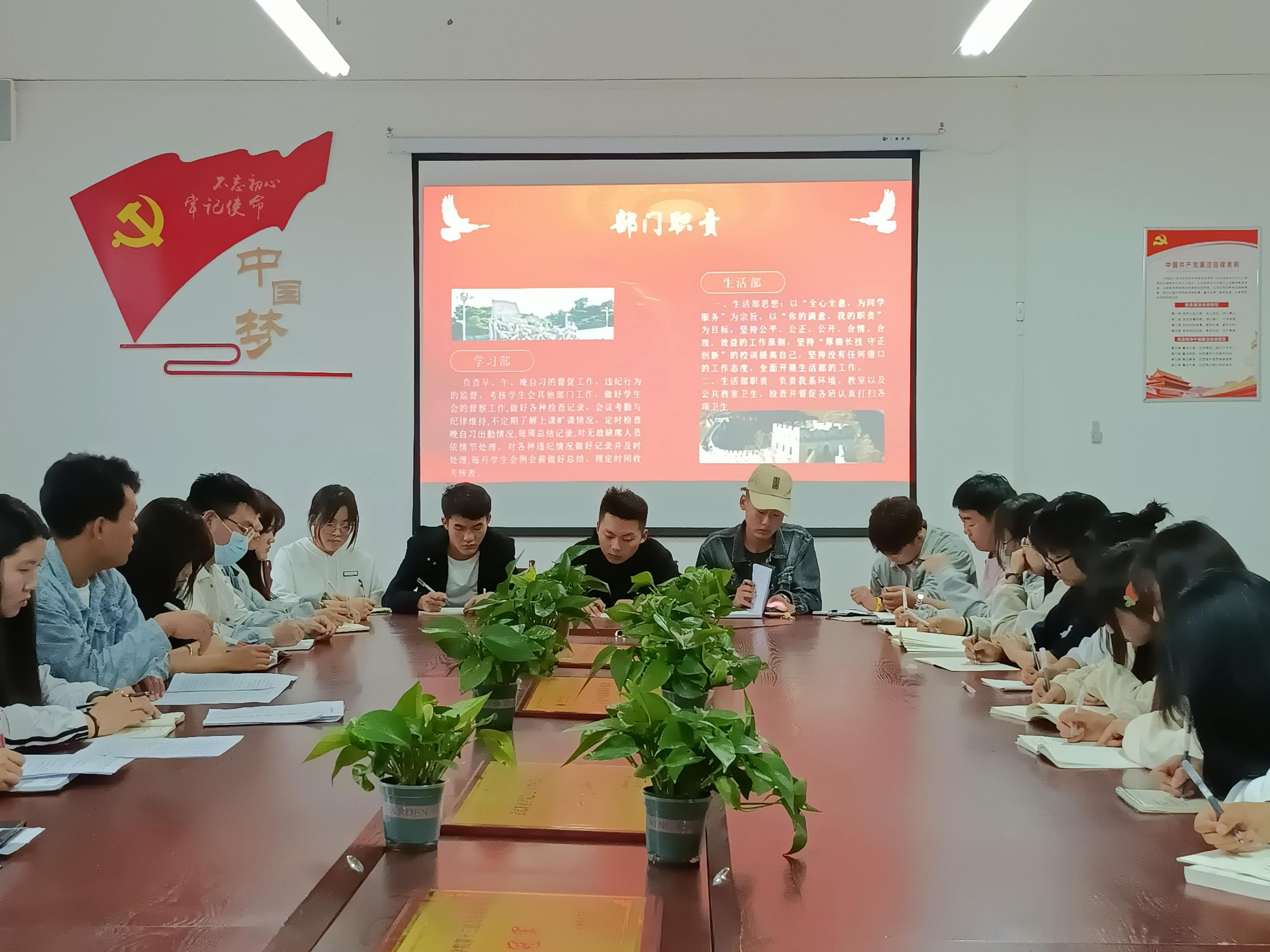 ? ? ? ? ??? ? ? ?會(huì)議第二項(xiàng)由胡瑞琪講述學(xué)生例會(huì)制度,為了更好的服務(wù)同學(xué),每次例會(huì)都會(huì)實(shí)行考勤制度,由各部長(zhǎng)向主席團(tuán)匯報(bào)本周的工作情況,再由主席團(tuán)向輔導(dǎo)員匯報(bào)本周問(wèn)題,并安排下周工作。接著我院主席團(tuán)成員尚寶萍表達(dá)了對(duì)團(tuán)學(xué)工作的充分肯定和支持,同時(shí)也提出了幾點(diǎn)工作的不足。各部門(mén)部長(zhǎng)也更加詳細(xì)的對(duì)工作內(nèi)容進(jìn)行了的介紹。??