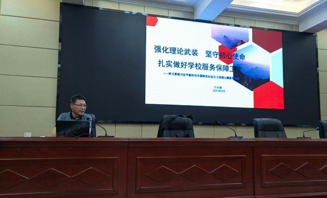 5月30日,學(xué)校黨委委員、副校長(zhǎng)王永緒以《強(qiáng)化理論武裝?堅(jiān)守初心使命——扎實(shí)做好學(xué)校服務(wù)保障工作》為題,在學(xué)校行樹樓北側(cè)學(xué)術(shù)報(bào)告廳講授學(xué)習(xí)貫徹習(xí)近平新時(shí)代中國(guó)特色社會(huì)主義思想主題教育專題黨課。后勤管理處黨員、干部職工參加黨課學(xué)習(xí)。