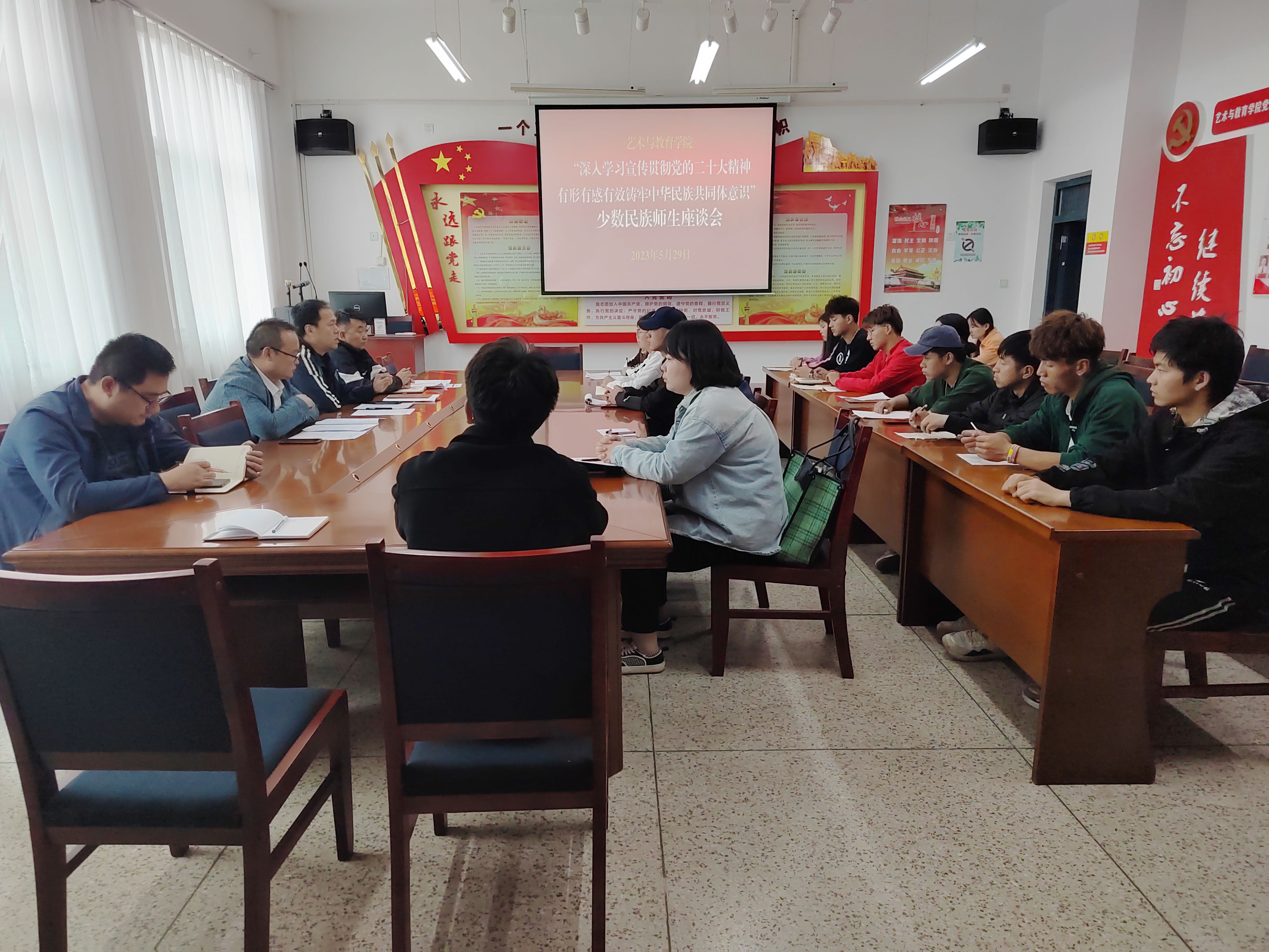 2023年5月29日下午,藝術與教育學院召開2023年第20個民族團結進步宣傳月各民族師生座談會,2022級各專業(yè)各民族學生代表,各民族師生代表和輔導員、班主任參加會議,會議由藝術與教育學院黨總支書記王政主持。