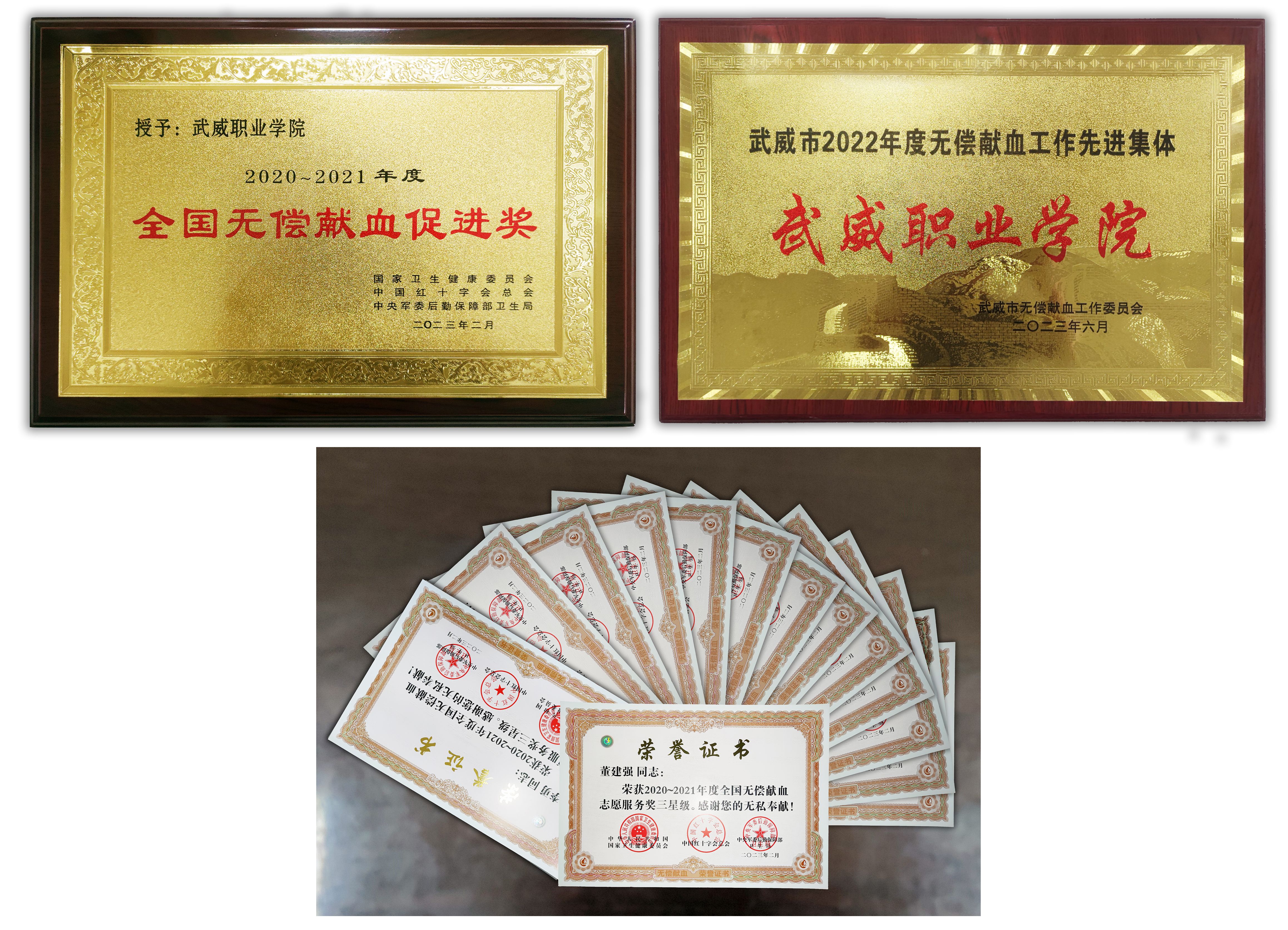 學(xué)校繼2020年獲得“2018-2019年度全國無償獻(xiàn)血促進(jìn)獎”后,再次榮獲“2020-2021年度全國無償獻(xiàn)血促進(jìn)獎”,14名師生榮獲全國無償獻(xiàn)血志愿服務(wù)獎。我校護(hù)理學(xué)院被評為武威市2022年度無償獻(xiàn)血工作先進(jìn)集體,1名教師被評為先進(jìn)個(gè)人。