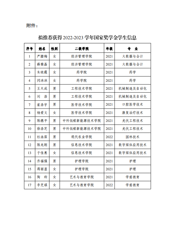 武威職業(yè)學院2022-2023學年國家獎學金候選人公示