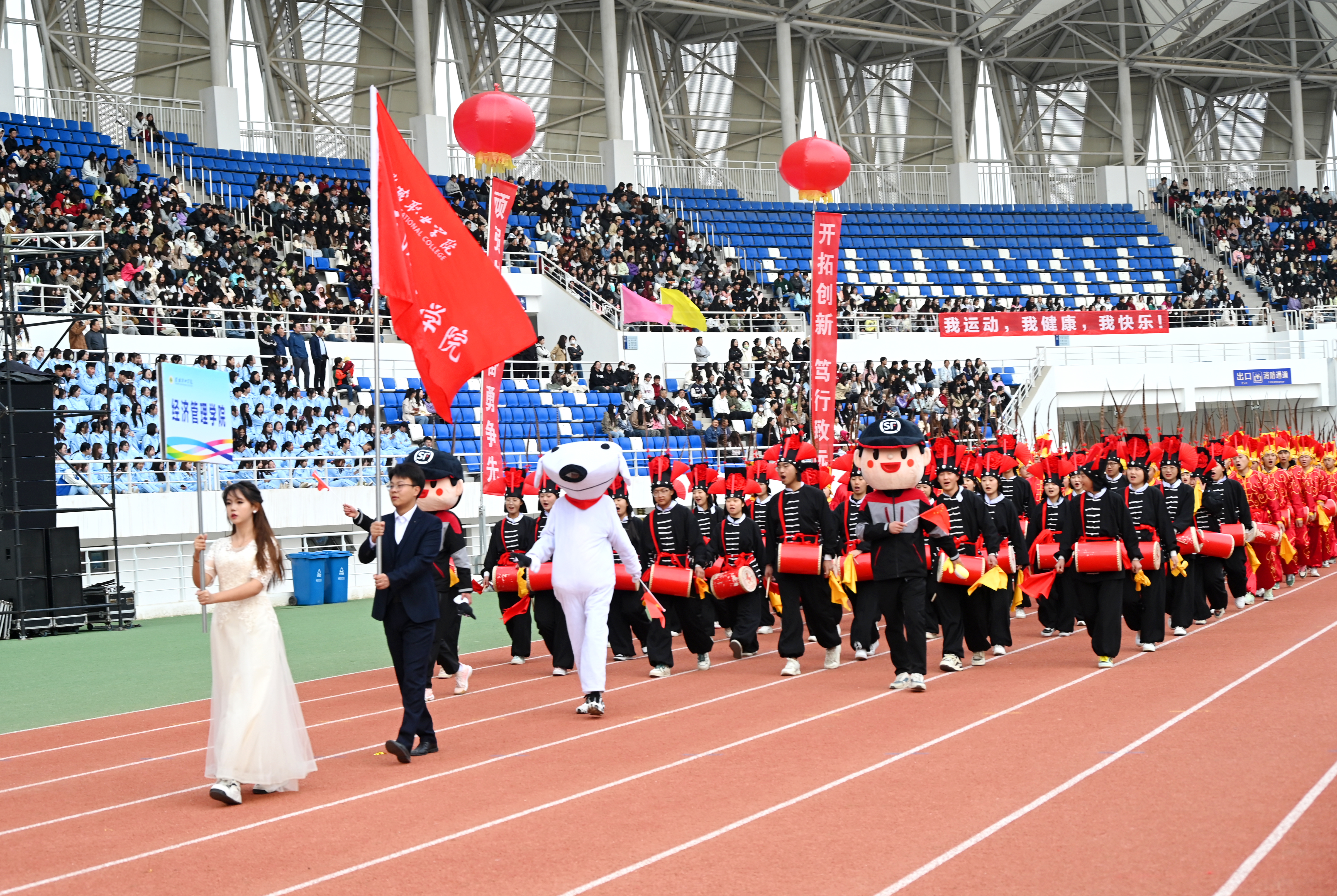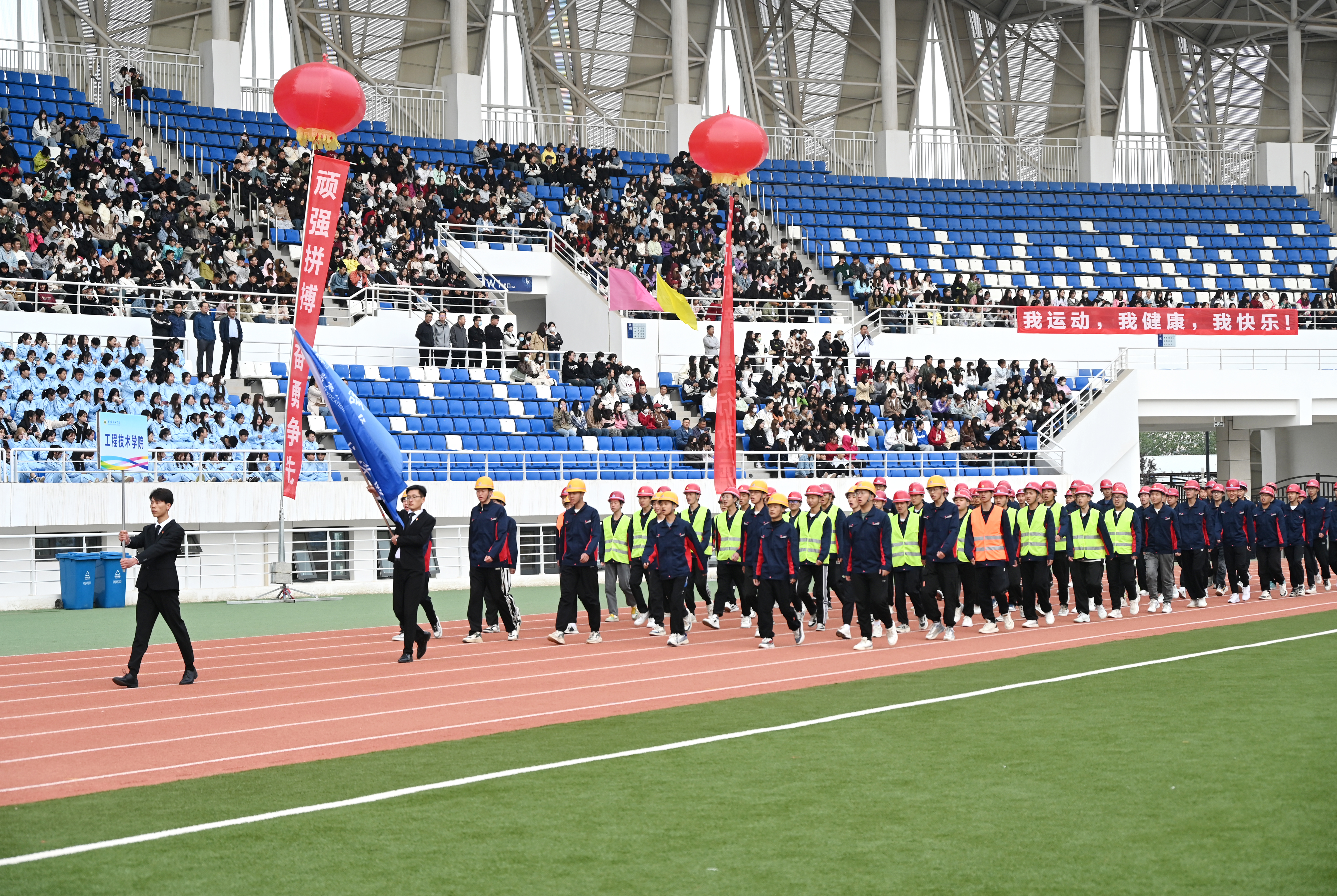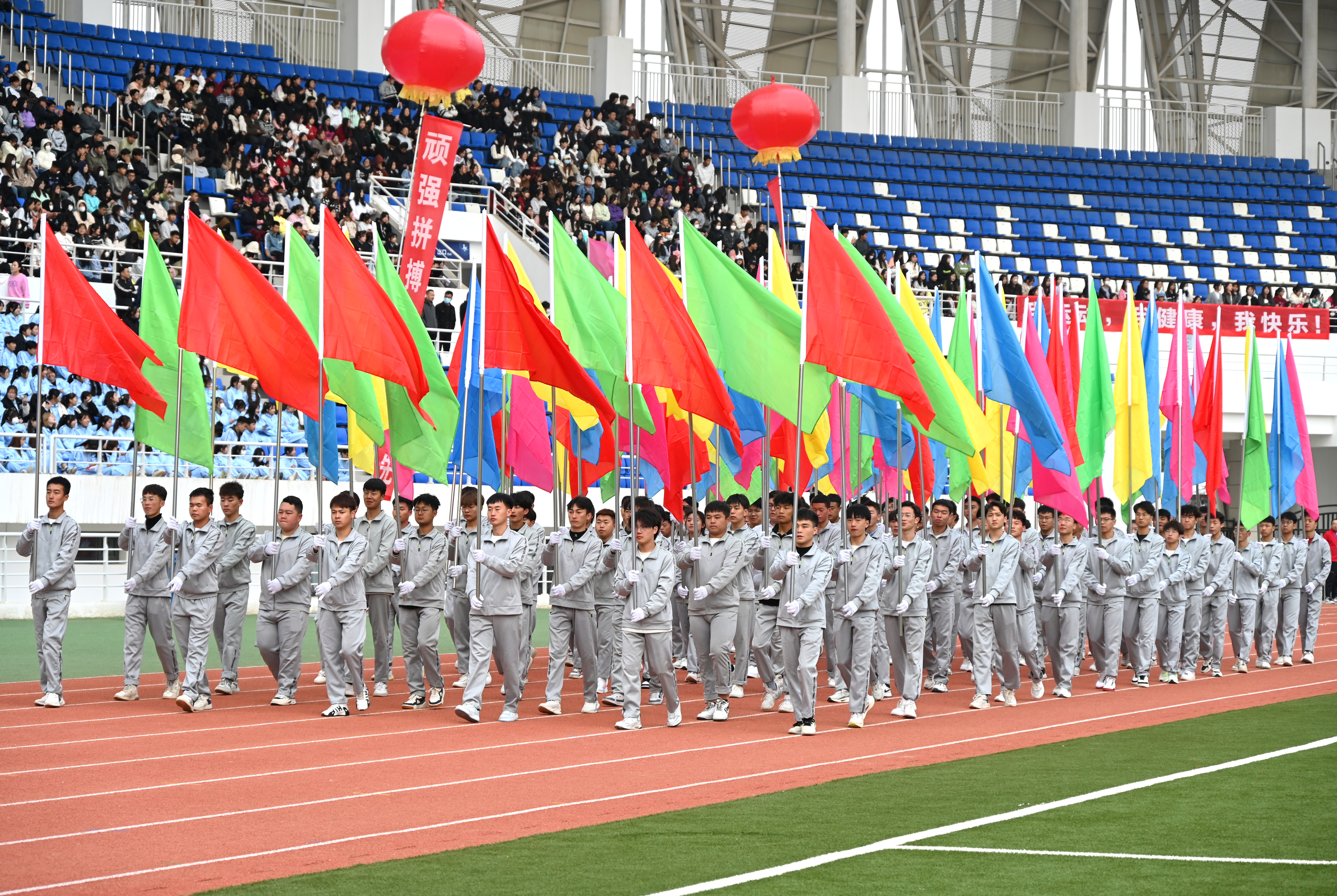 伴隨著雄壯激越的運動員進行曲,國旗護衛(wèi)隊、彩旗隊、裁判員隊伍、各二級學(xué)院方陣依次入場,隊列步伐整齊有力,口號堅定嘹亮,充分展示了師生良好的精神風貌。