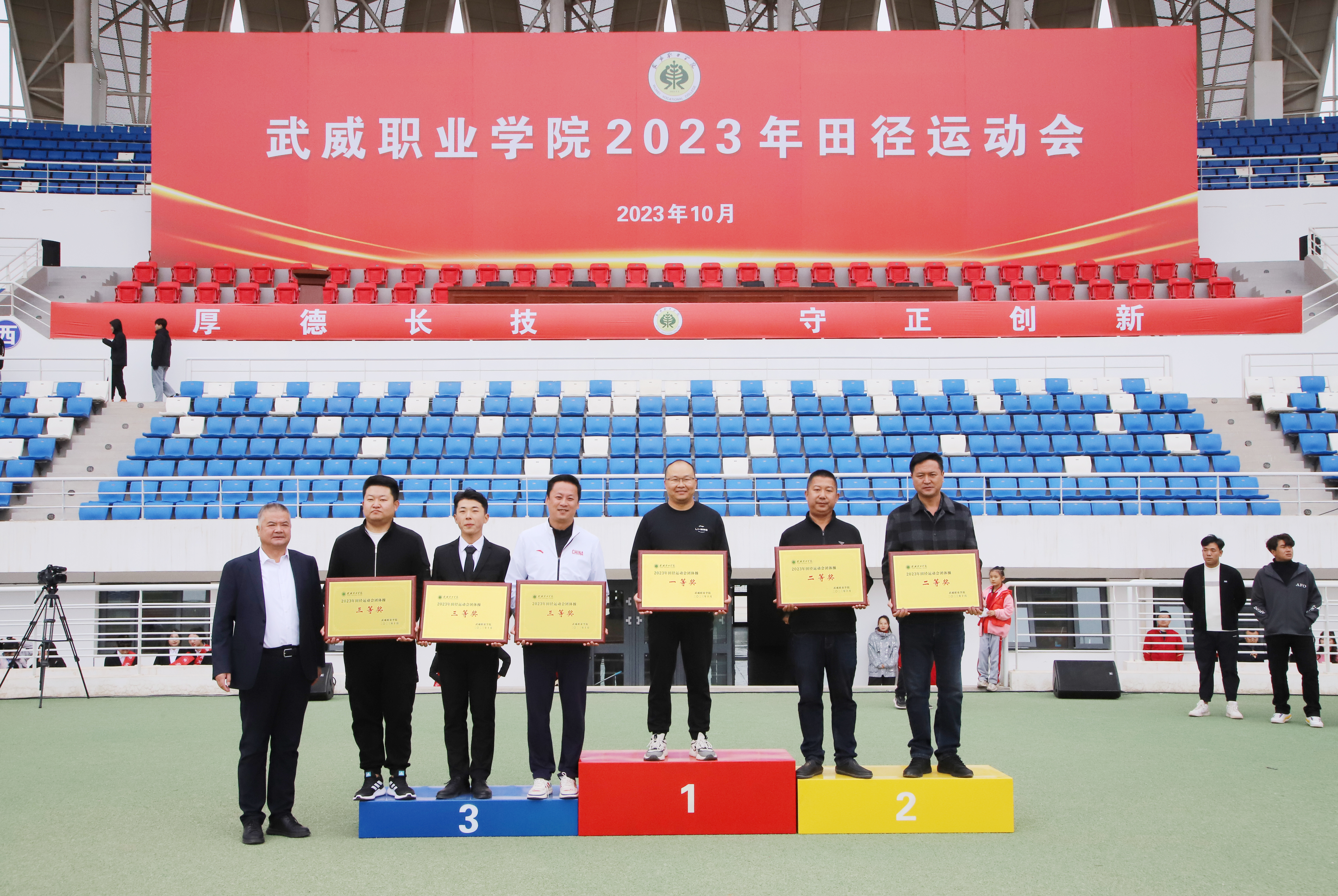 經(jīng)過三天的激烈角逐,各項比賽圓滿結(jié)束,武威職業(yè)學(xué)院2023年田徑運動會圓滿落幕。本次運動會共設(shè)21個項目,其中競賽14項、趣味賽7項,共有運動員1129人參加。最終,護理學(xué)院榮獲團體總分第一名,藝術(shù)與教育學(xué)院、經(jīng)濟管理學(xué)院榮獲團體總分并列第二名,藥學(xué)院榮獲團體總分第三名。