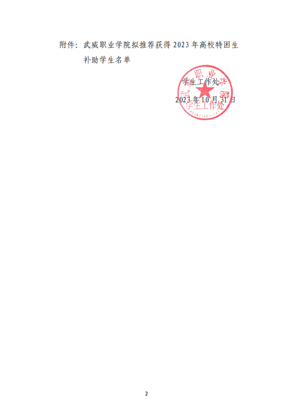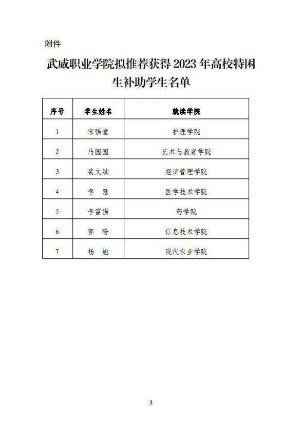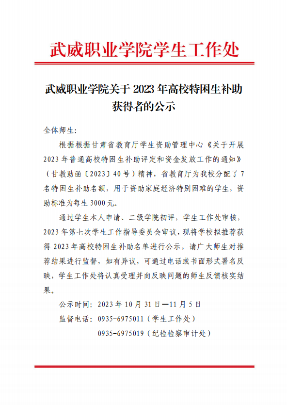 武威職業(yè)學院關(guān)于2023年高校特困生補助獲得者的公示