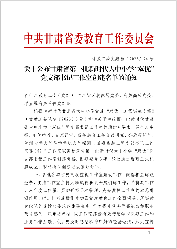 近日,中共甘肅省委教育工作委員會(huì)公布了《關(guān)于公布甘肅省第一批新時(shí)代大中小學(xué)“雙優(yōu)”黨支部書(shū)記工作室創(chuàng)建名單的通知》(甘教工委黨建函〔2023〕24號(hào)),全省高校32個(gè)黨支部書(shū)記工作室獲批創(chuàng)建資格,中科低碳新能源技術(shù)學(xué)院教師黨支部書(shū)記工作室(支部書(shū)記黃述杰教授)成功入選,獲得創(chuàng)建資格。
