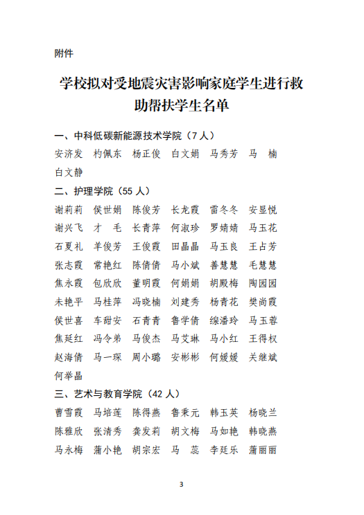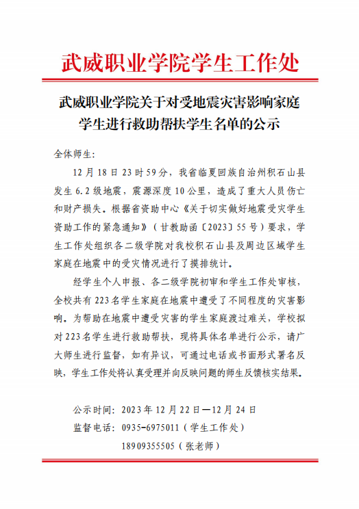 武威職業(yè)學(xué)院關(guān)于對(duì)受地震災(zāi)害影響家庭學(xué)生進(jìn)行救助幫扶學(xué)生名單的公示