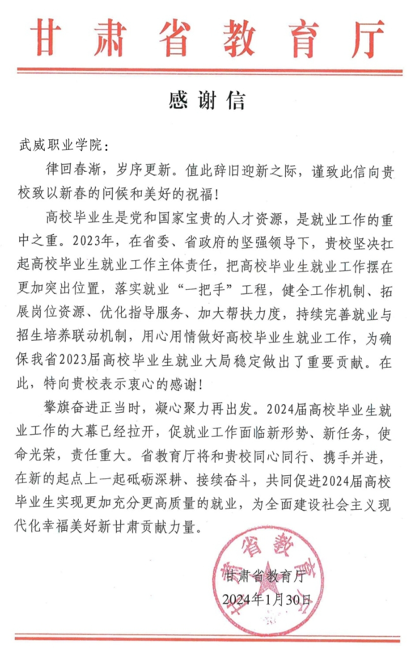 近日,甘肅省教育廳向我校發(fā)來感謝信,信中對學(xué)校為2023屆高校畢業(yè)生就業(yè)工作做出的重要貢獻致以感謝,對學(xué)校在高校畢業(yè)生就業(yè)工作中的突出表現(xiàn)作出肯定,表揚學(xué)校堅決扛起高校畢業(yè)生就業(yè)工作主體責(zé)任,把高校畢業(yè)生就業(yè)工作擺在更加突出位置,落實就業(yè)“一把手”工程,健全工作機制、拓展崗位資源、優(yōu)化指導(dǎo)服務(wù)、加大幫扶力度,持續(xù)完善就業(yè)與招生培養(yǎng)聯(lián)動機制,用心用情做好高校畢業(yè)生就業(yè)工作。