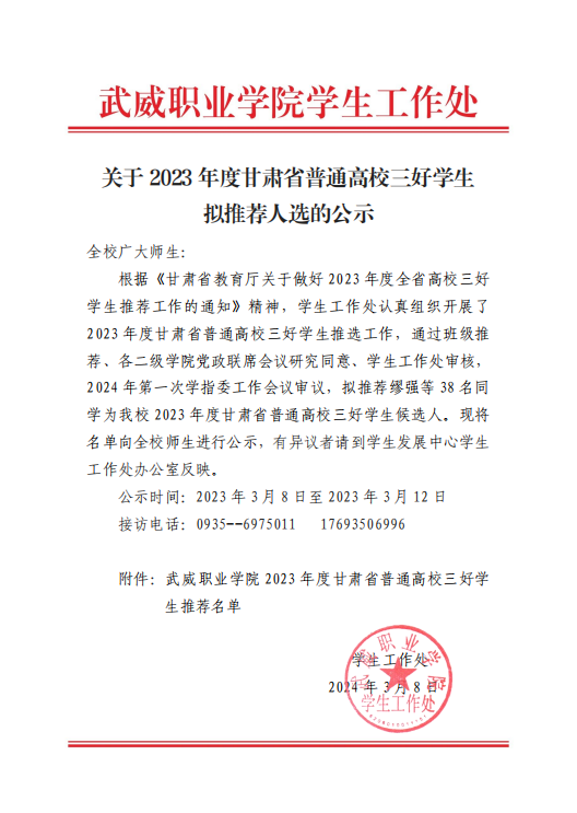 關(guān)于2023年度甘肅省普通高校三好學生擬推薦人選的公示