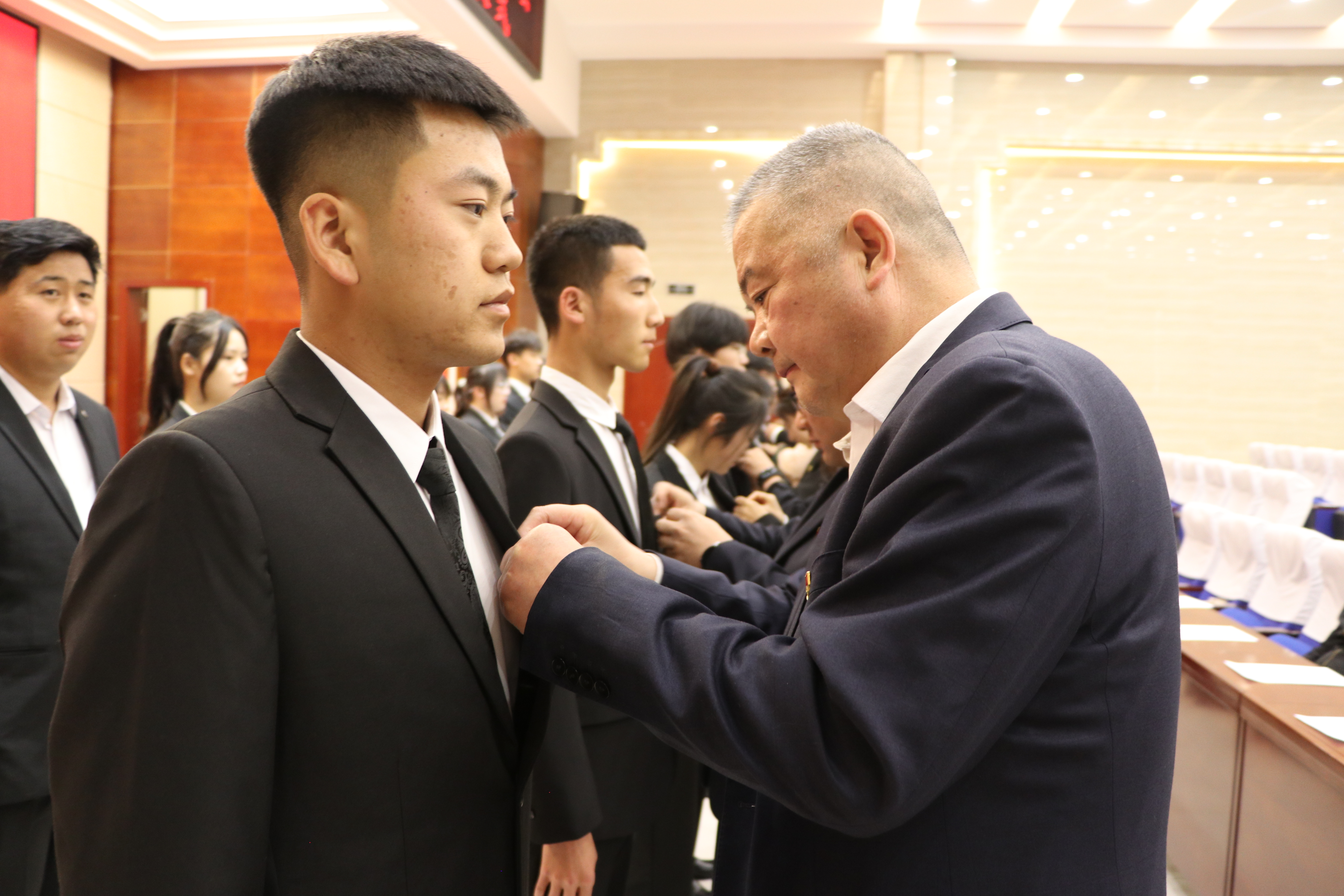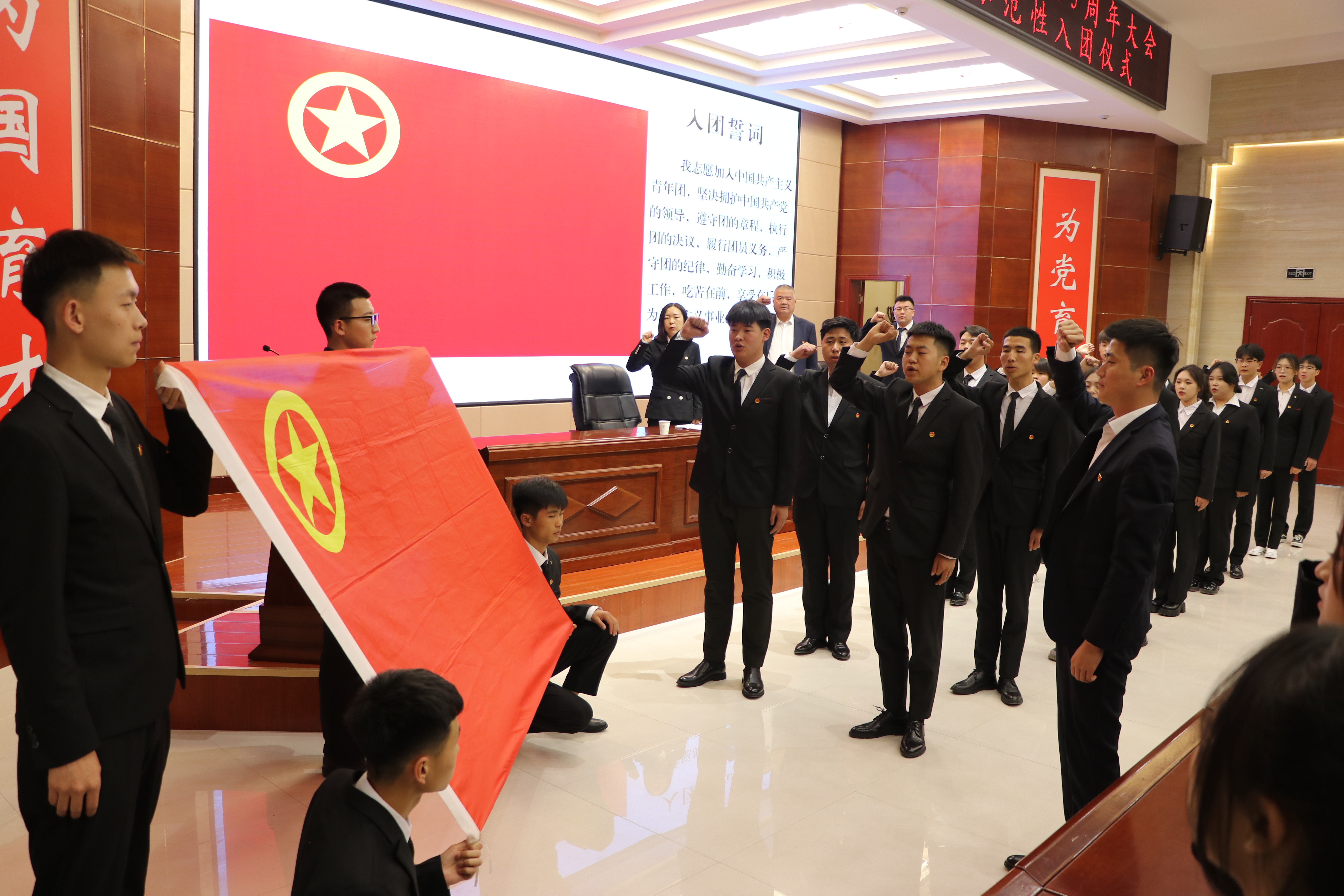 入團(tuán)儀式上,校團(tuán)委副書記劉吉仁宣讀235名新團(tuán)員名單,與會(huì)領(lǐng)導(dǎo)、各二級(jí)學(xué)院團(tuán)委書記為新團(tuán)員代表佩戴團(tuán)徽舉行頒發(fā)禮,全體新老團(tuán)員面向團(tuán)旗莊嚴(yán)宣誓。
