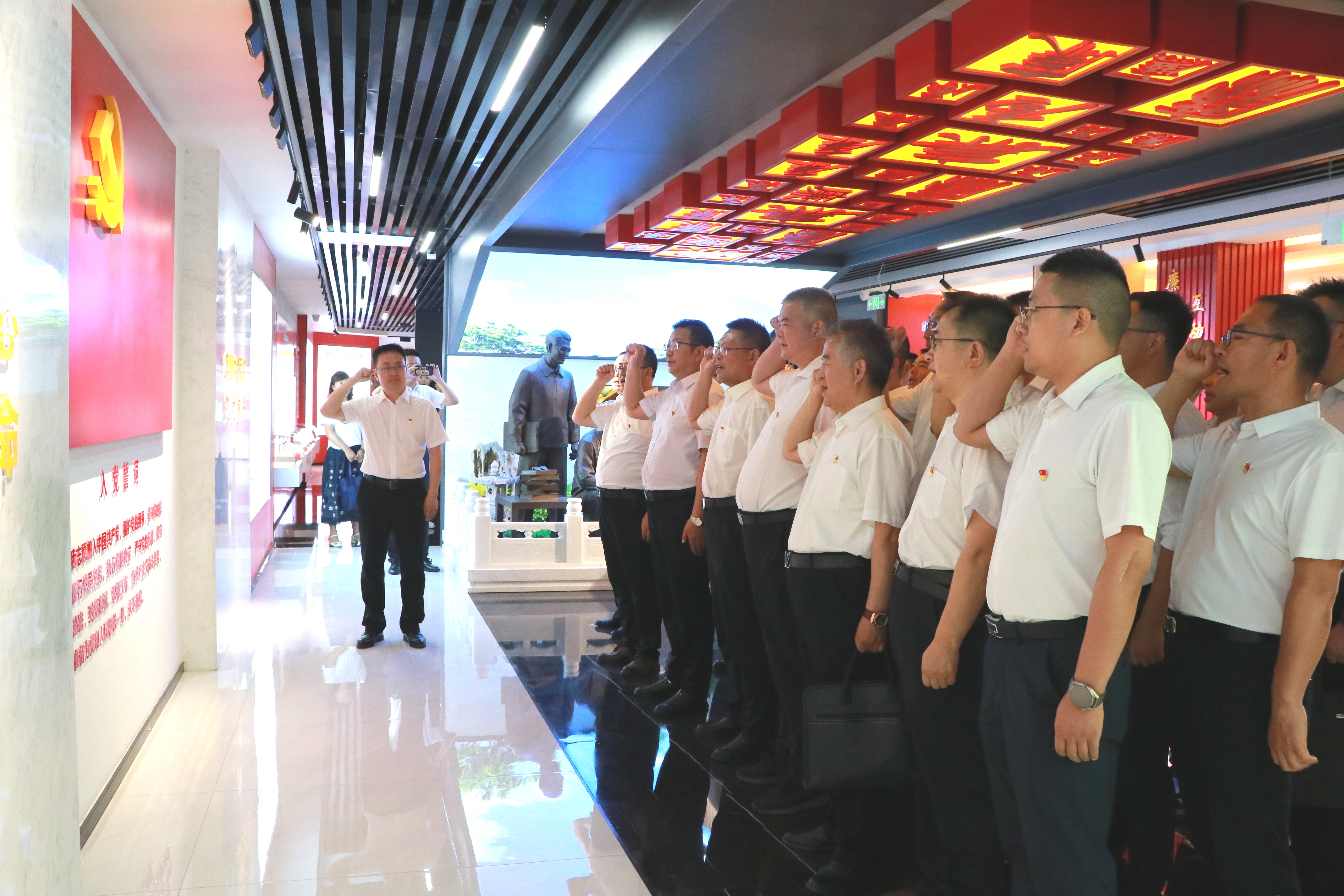 在入黨宣誓大廳,全體黨員干部神情肅穆,整齊列隊,面向鮮紅的黨旗,以飽滿的熱情和昂揚的姿態(tài)重溫了入黨時的錚錚誓言,再一次感受入黨的光榮神圣,再一次經(jīng)受靈魂和黨性的洗禮,表達為黨的事業(yè)奮斗終身的決心和堅定信念。