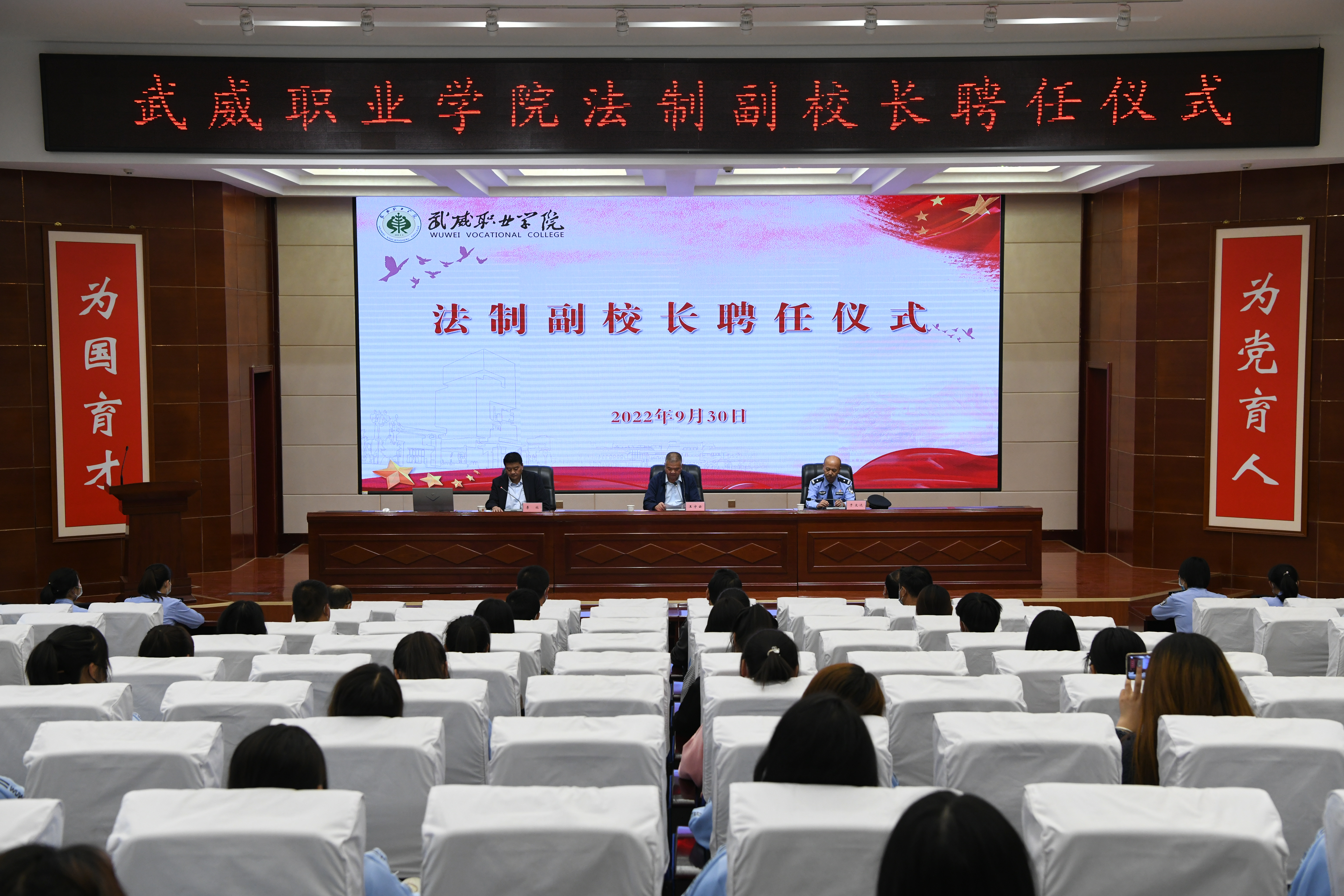9月30日下午,學(xué)校在學(xué)生發(fā)展中心菁英廳舉行法制副校長聘任儀式,武威市涼州區(qū)公安局西關(guān)派出所所長于文達(dá)、西關(guān)派出所民警代表,學(xué)校相關(guān)部門、各二級(jí)學(xué)院負(fù)責(zé)人及師生代表參加了聘任儀式,學(xué)校黨委委員、副校長王守云出席了儀式,儀式由學(xué)校安全保衛(wèi)處負(fù)責(zé)人李欣主持。