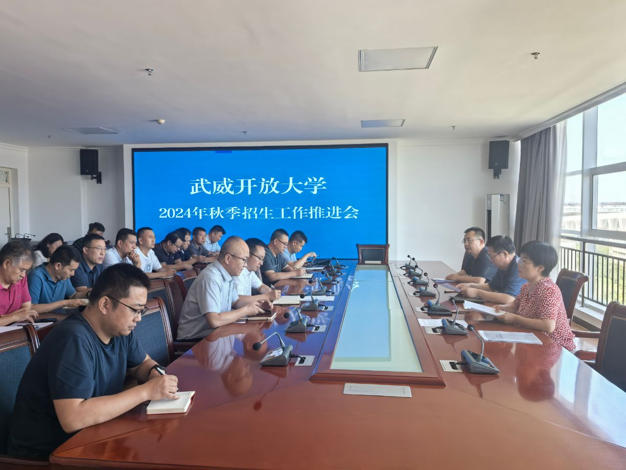 為進一步提升招生工作潛能、規(guī)范招生工作管理、創(chuàng)新招生工作思路,推動招生工作取得新成效。8月15日上午,武威開放大學召開了2024年秋季招生工作推進會。校長張開禮及其他在家校領(lǐng)導、全體中層干部及武威職業(yè)學院各部門和二級學院負責人參加會議,會議由副校長何毅主持。