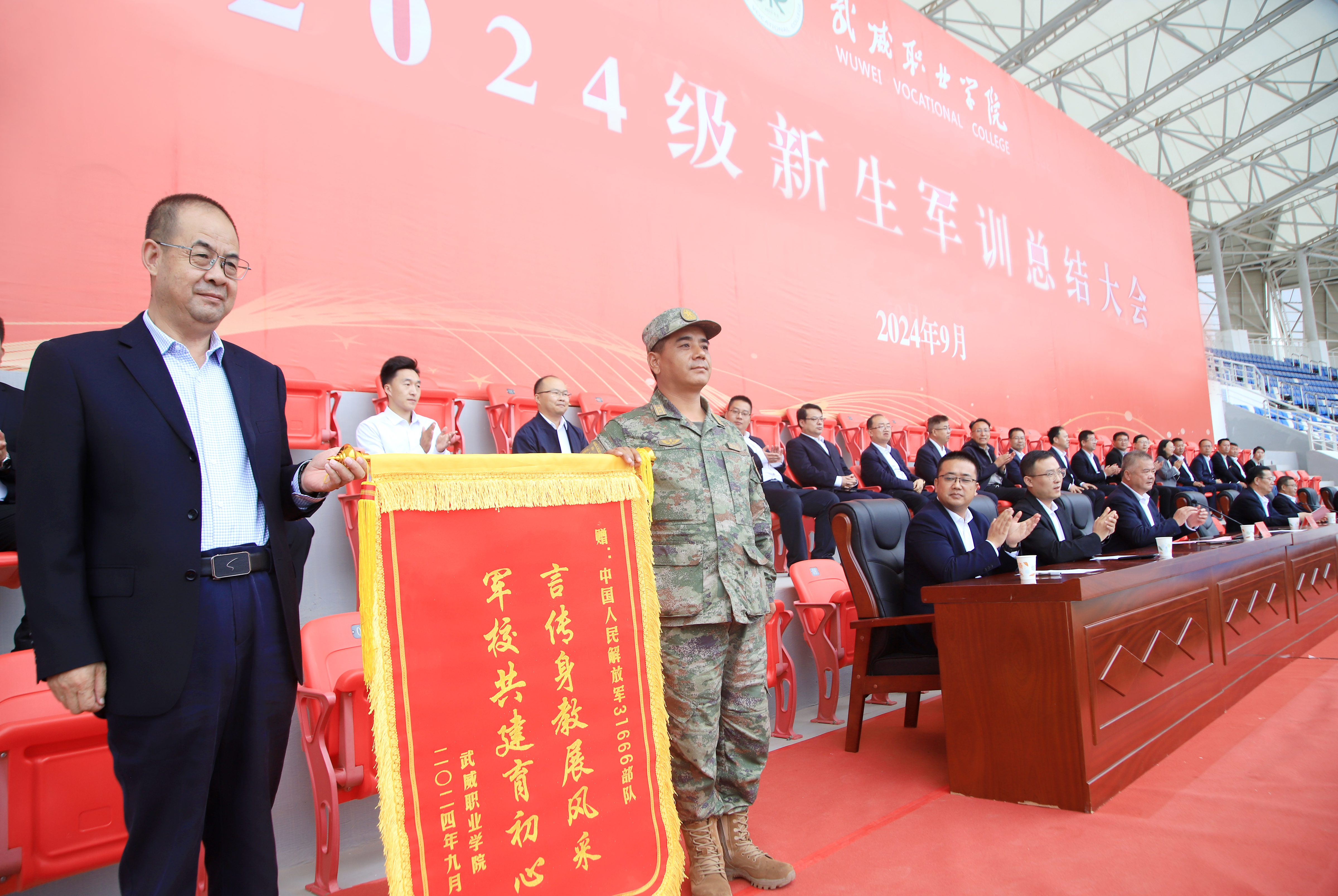 會(huì)上,翟存祥代表學(xué)校向承訓(xùn)部隊(duì)贈(zèng)送錦旗致以崇高的敬意,向奮戰(zhàn)在訓(xùn)練一線(xiàn)的軍訓(xùn)教官及工作人員表示衷心的感謝!陳曉煜宣讀了2024級(jí)新生軍訓(xùn)工作先進(jìn)集體、先進(jìn)個(gè)人、優(yōu)秀教官和軍訓(xùn)標(biāo)兵擬表彰名單。與會(huì)領(lǐng)導(dǎo)為軍訓(xùn)先進(jìn)集體和個(gè)人頒發(fā)了獎(jiǎng)牌和榮譽(yù)證書(shū)。