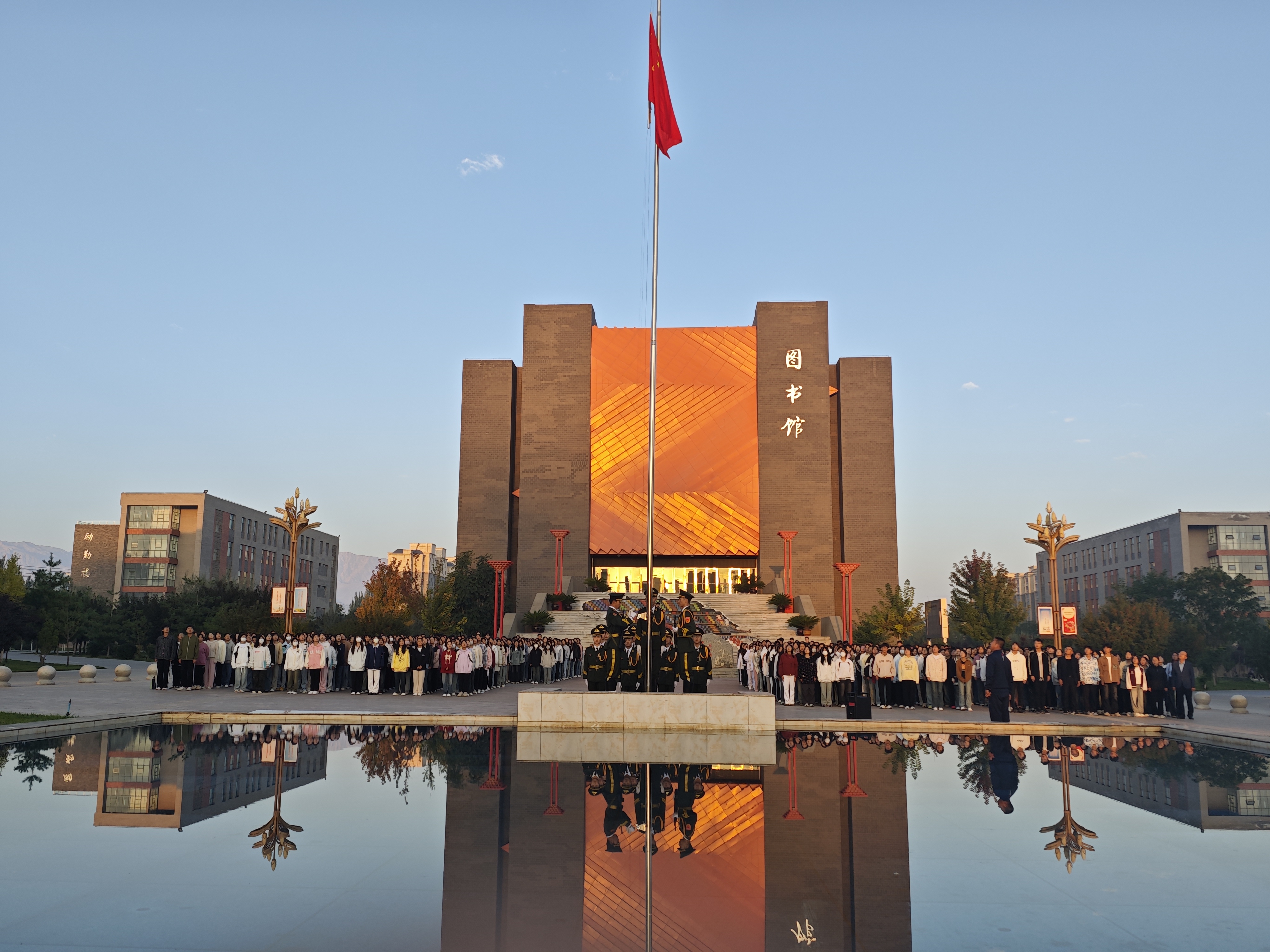 七點(diǎn)十五分,升國旗儀式正式開始。在全體師生的注視下,國旗護(hù)衛(wèi)隊(duì)邁著整齊的步伐護(hù)送五星紅旗進(jìn)場(chǎng),伴隨著莊嚴(yán)的《義勇軍進(jìn)行曲》,五星紅旗冉冉升起。全體師生肅穆而立,行注目禮,齊唱國歌。