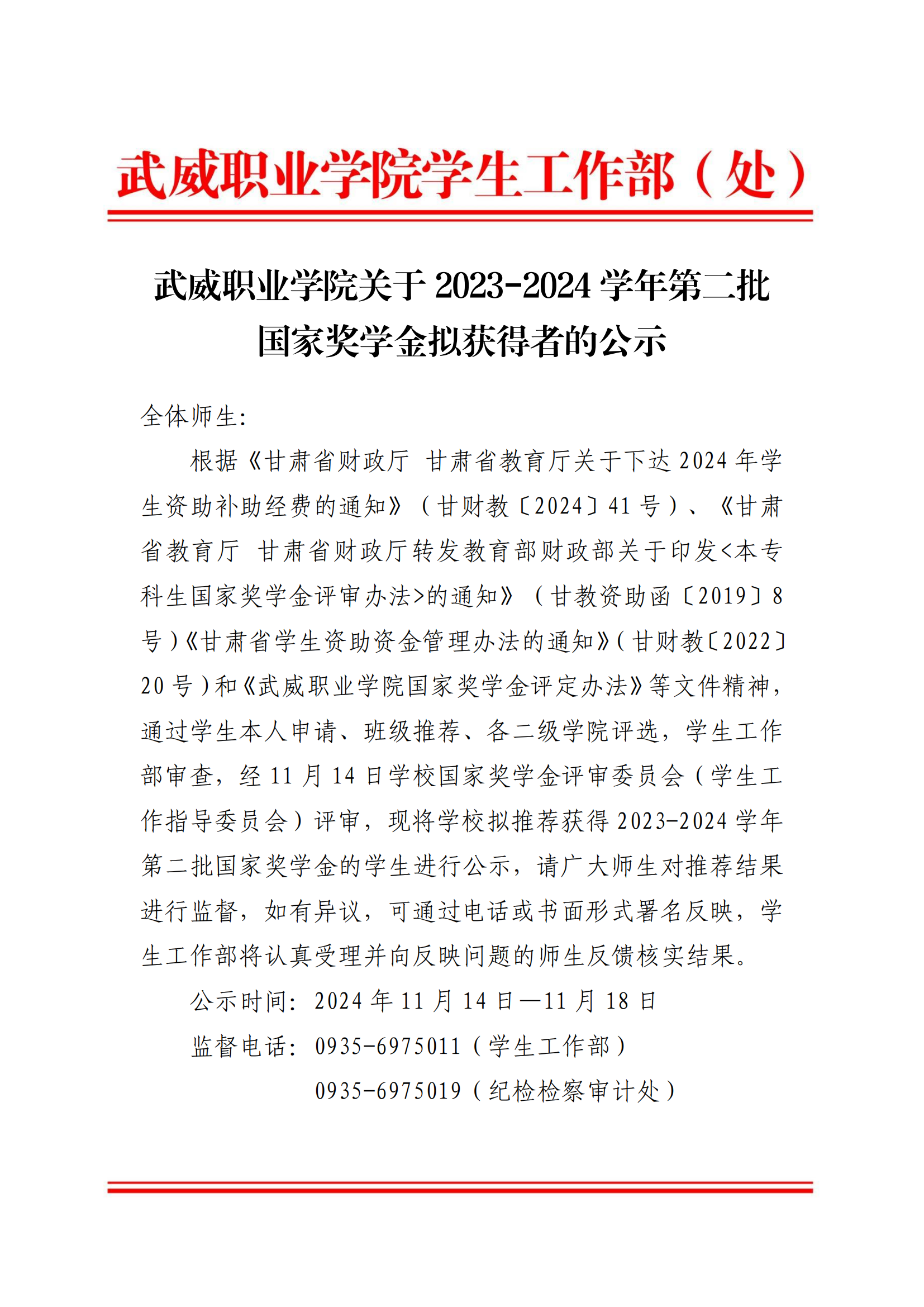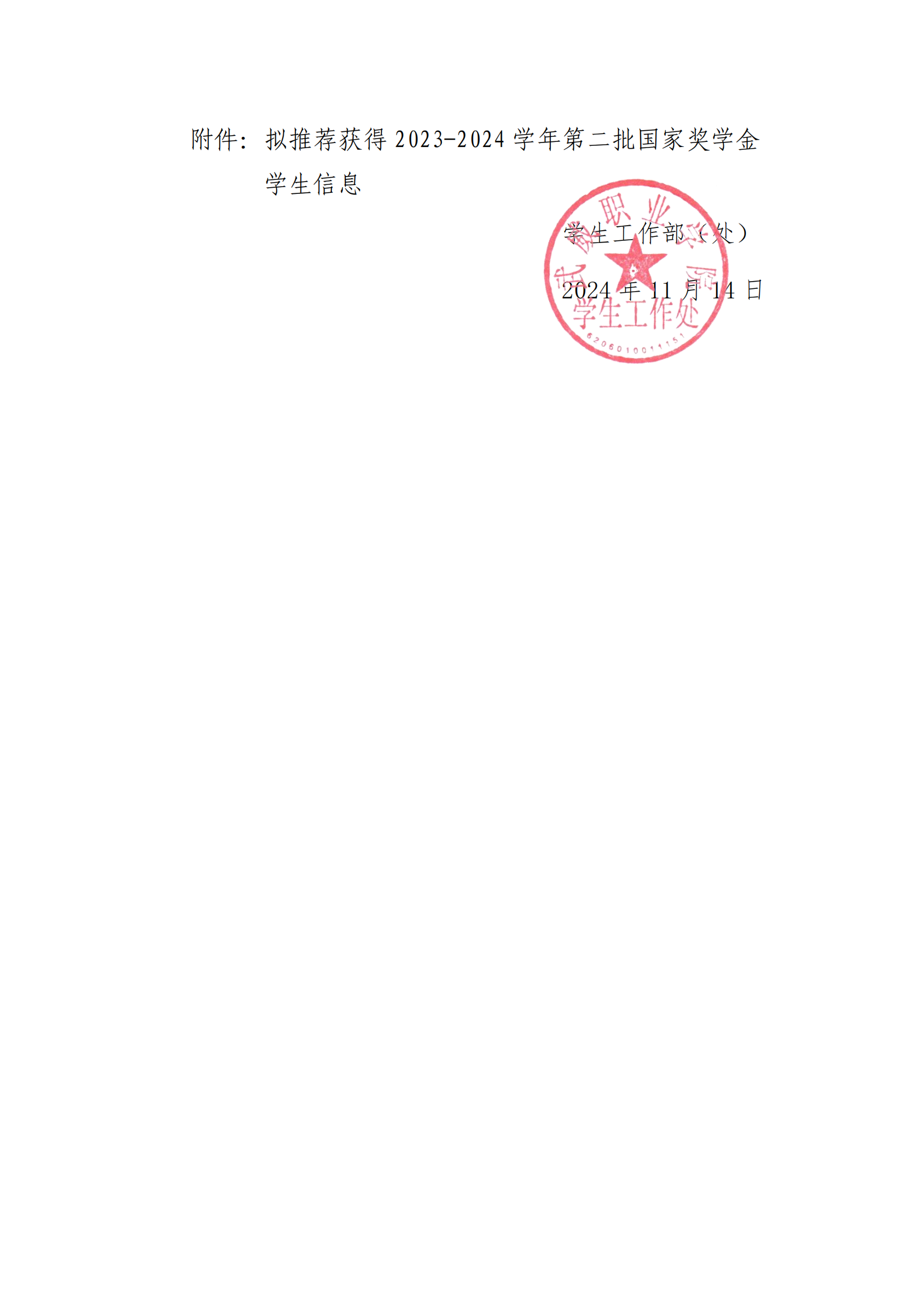 武威職業(yè)學院關(guān)于2023-2024學年第二批國家獎學金擬獲得者的公示