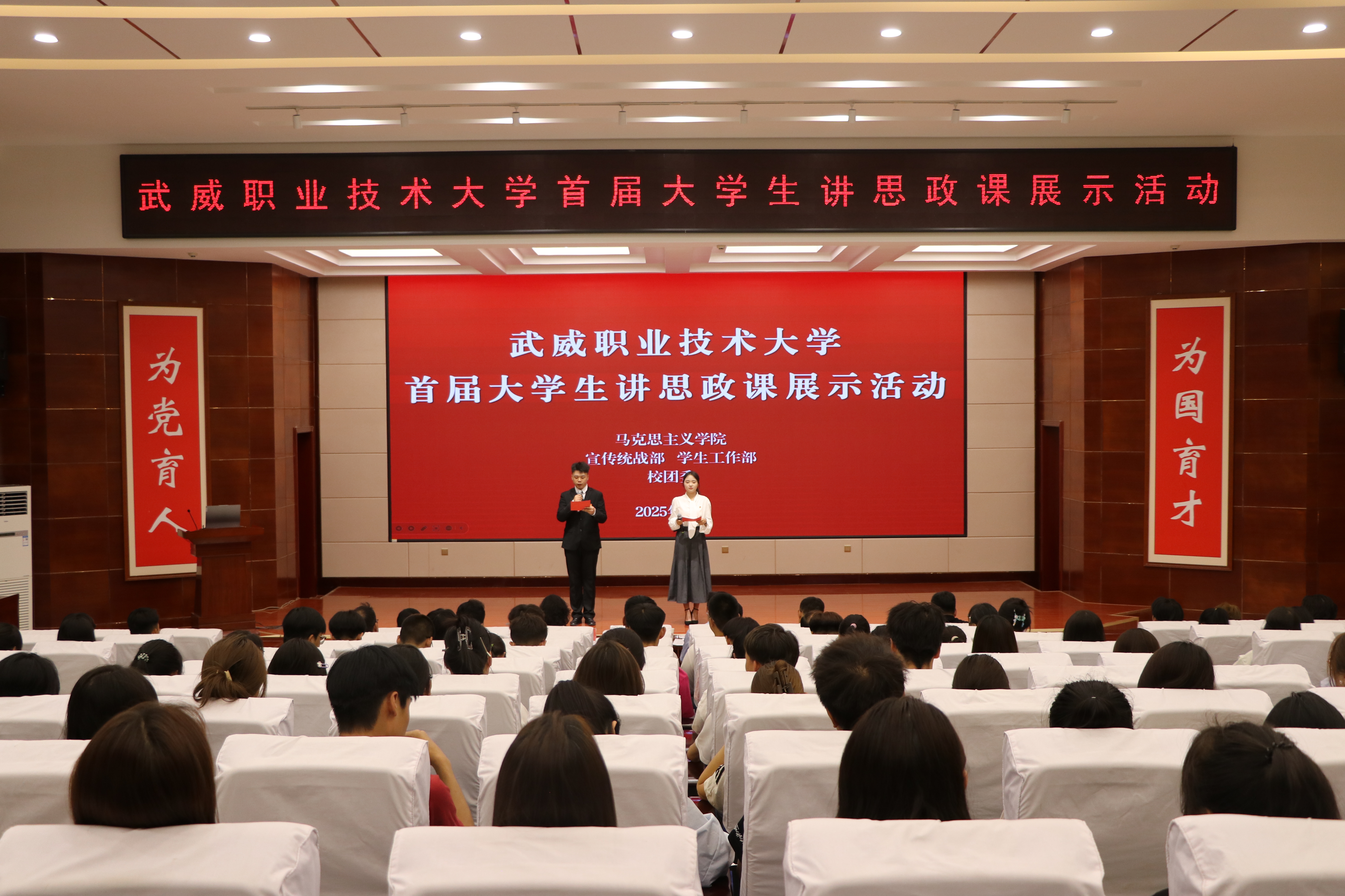 為深入學(xué)習(xí)貫徹習(xí)近平總書記對(duì)學(xué)校思政課建設(shè)的重要指示精神,推進(jìn)“大思政課”建設(shè),加強(qiáng)對(duì)廣大青年學(xué)子的政治引領(lǐng),提升學(xué)校思政育人實(shí)效,6月25日,武威職業(yè)技術(shù)大學(xué)首屆大學(xué)生講思政課展示活動(dòng)在學(xué)校菁英廳成功舉辦。黨委委員、黨委組織部部長(zhǎng)任陶出席活動(dòng)并講話,各二級(jí)學(xué)院負(fù)責(zé)人及全體思政課教師、學(xué)生代表共200余人參加了活動(dòng)。