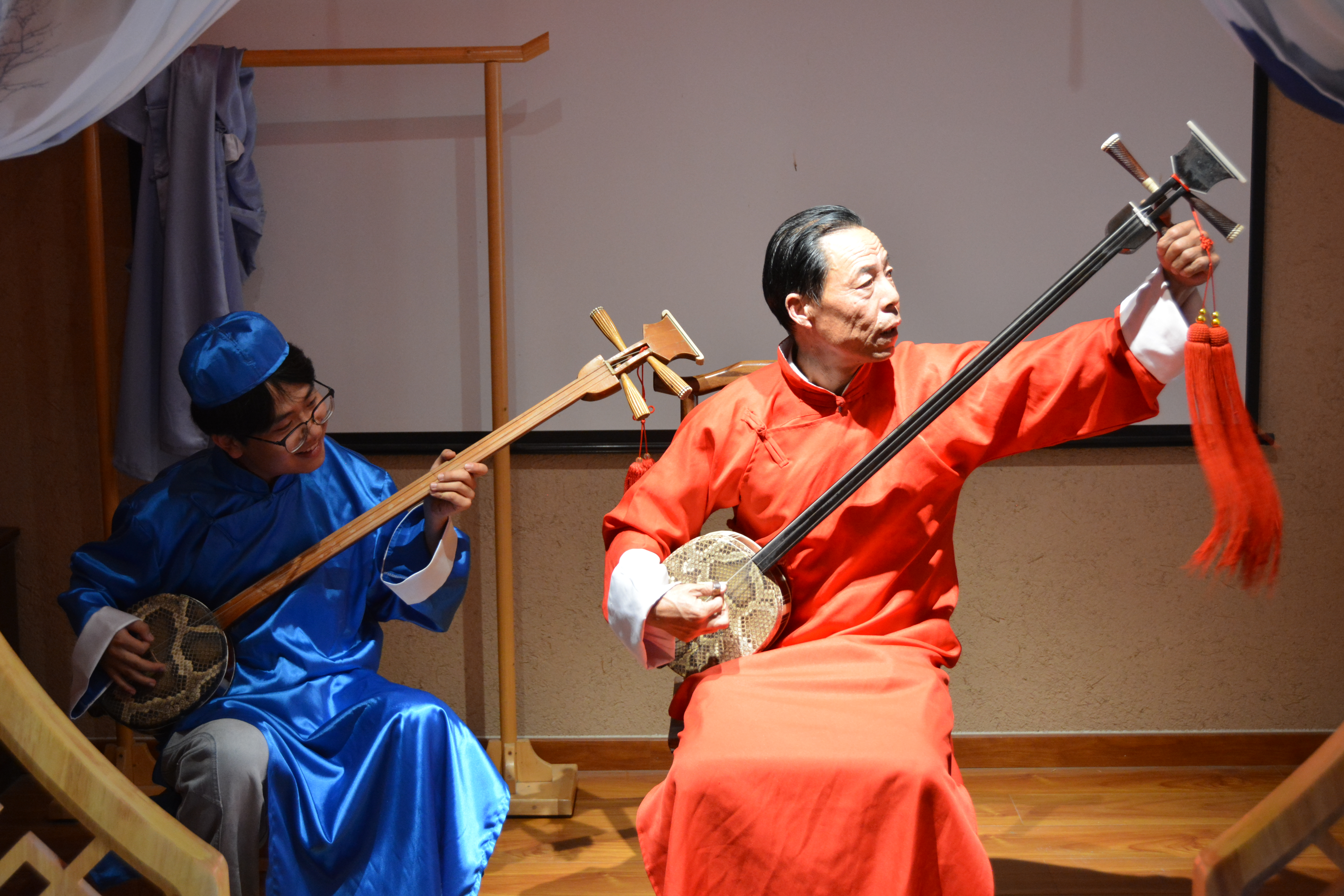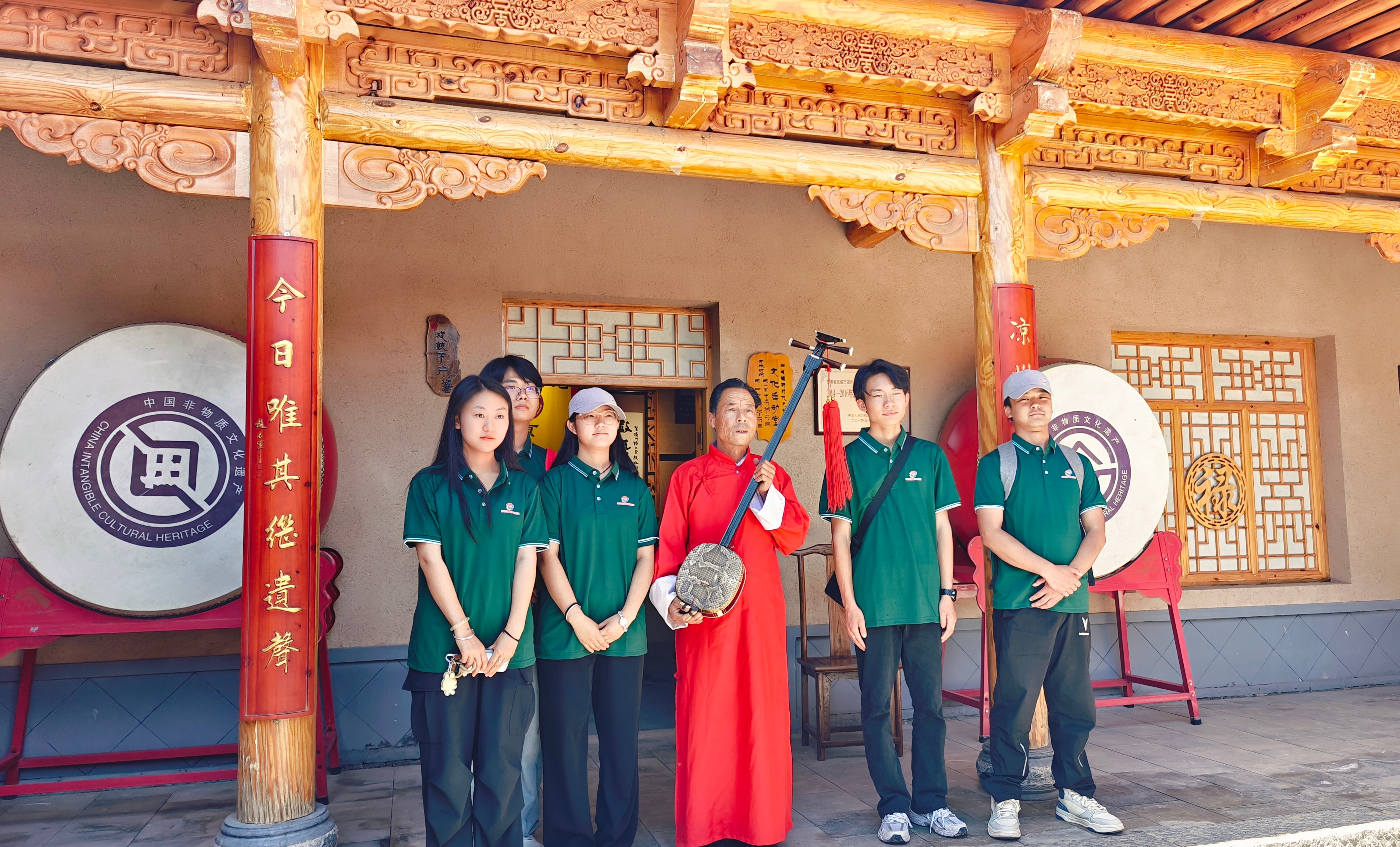 非遺民俗文化館當(dāng)天化身成為一座流動(dòng)的非遺課堂,實(shí)踐團(tuán)成員們圍坐在古樸的庭院中,聚精會(huì)神地聆聽當(dāng)?shù)刭Y深賢孝藝人董永虎老師深情演繹的經(jīng)典曲目。老藝人蒼勁而富有穿透力的嗓音,伴著三弦琴弦的顫動(dòng),將一段段蘊(yùn)含忠孝節(jié)義、勸人向善的古老故事娓娓道來。那飽經(jīng)歲月洗禮的曲調(diào),仿佛穿越時(shí)空,在青磚黛瓦間回蕩,讓在場(chǎng)的每一位學(xué)子都深深沉浸其中,體味著這門古老說唱藝術(shù)所承載的歷史重量與人文溫度。