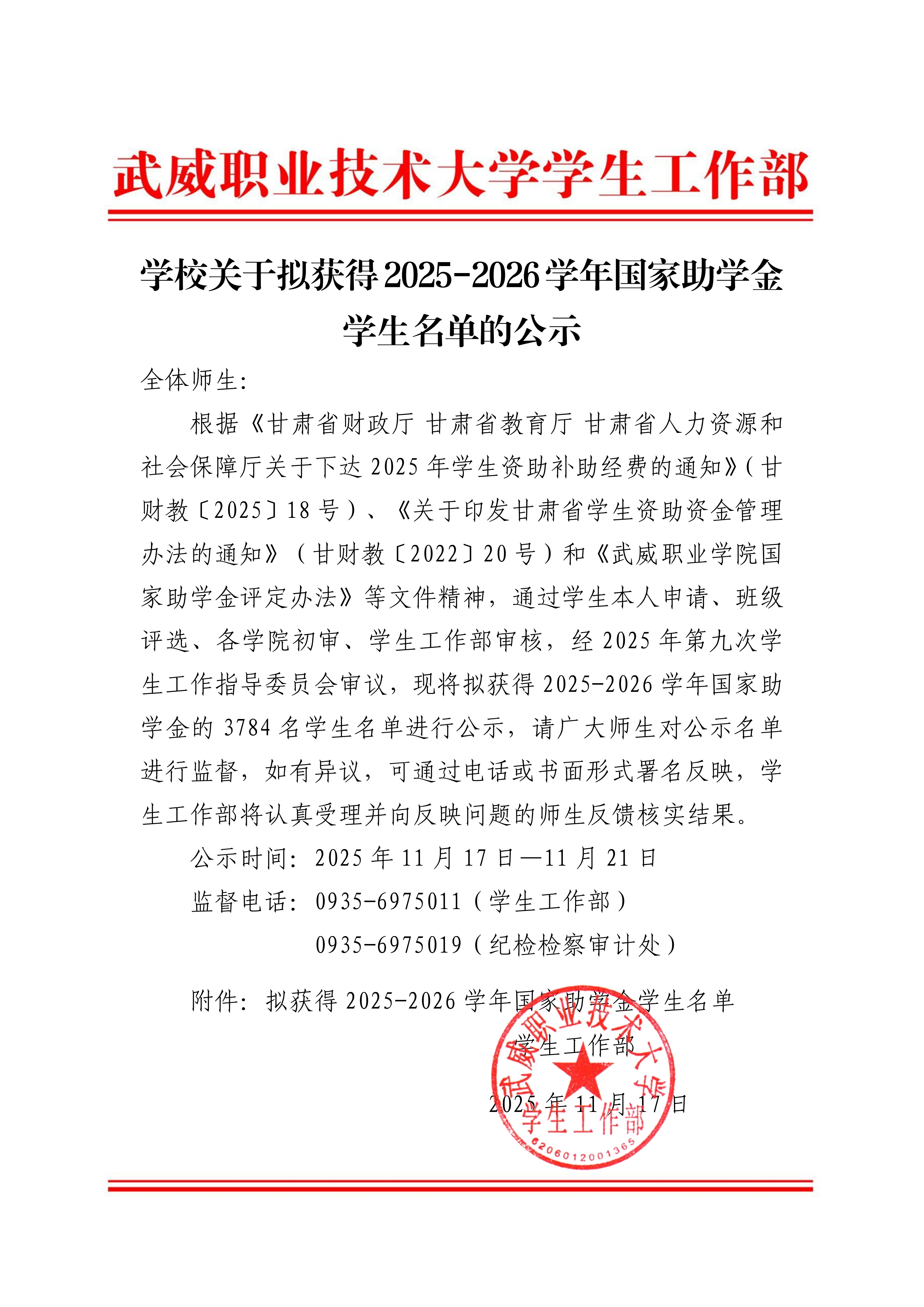 學(xué)校關(guān)于擬獲得2025-2026學(xué)年國(guó)家助學(xué)金學(xué)生名單的公示