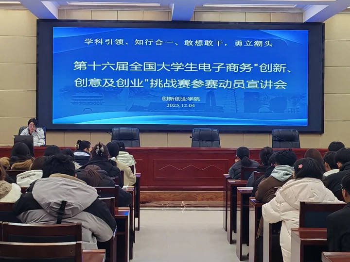 為積極備戰(zhàn)第十六屆全國(guó)大學(xué)生電子商務(wù)“創(chuàng)新、創(chuàng)意及創(chuàng)業(yè)”挑戰(zhàn)賽,激發(fā)學(xué)生參賽熱情,提升項(xiàng)目質(zhì)量,創(chuàng)新創(chuàng)業(yè)學(xué)院于12月4日在行樹樓北側(cè)報(bào)告廳舉行大賽動(dòng)員宣講會(huì)。來(lái)自全校9個(gè)學(xué)院的師生代表共計(jì)120人參加了本次動(dòng)員會(huì)。