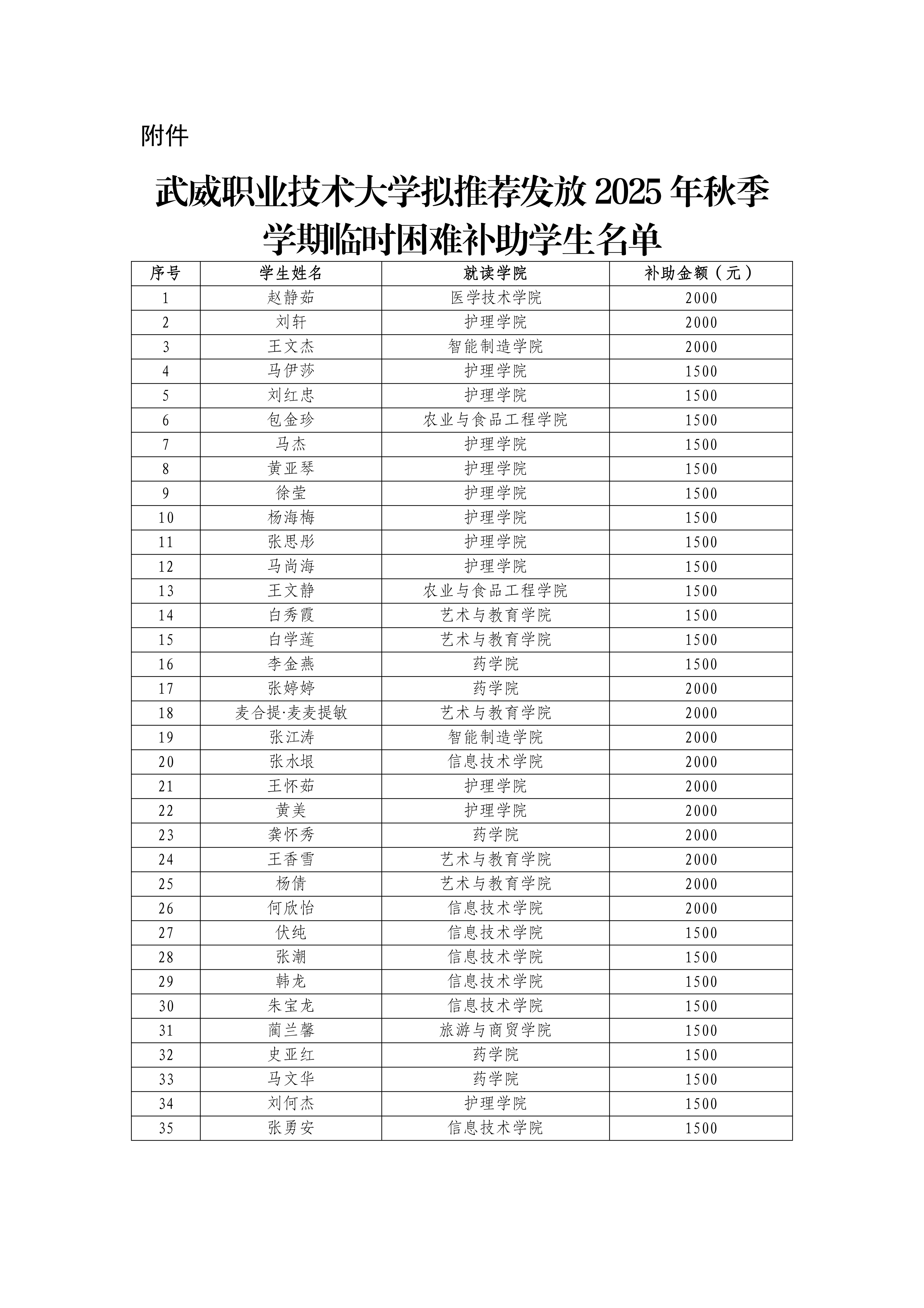 武威職業(yè)技術大學關于向趙靜茹35名學生發(fā)放臨時困難補助的公示