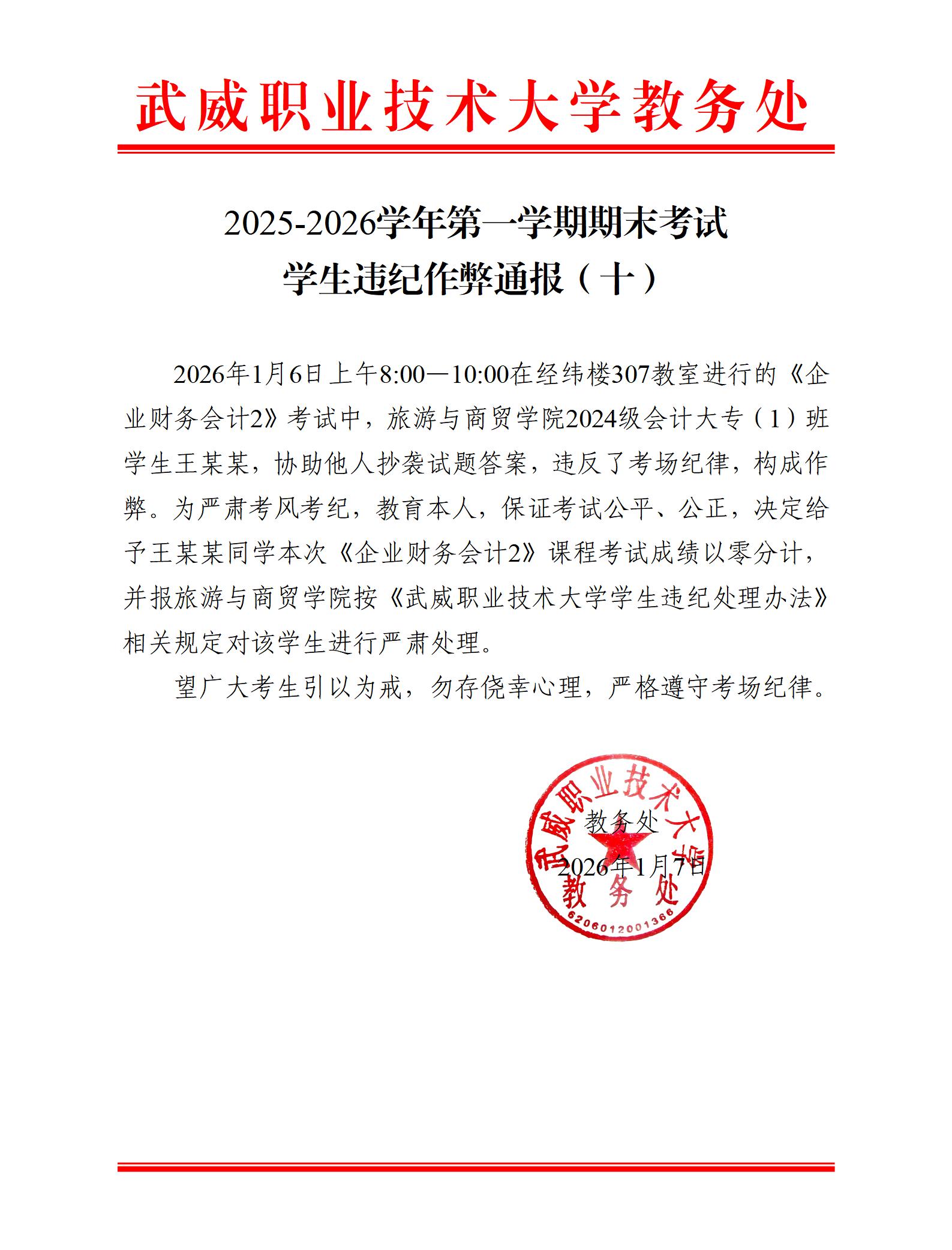 2025-2026學(xué)年第一學(xué)期期末考試學(xué)生違紀(jì)作弊通報(bào)(十)