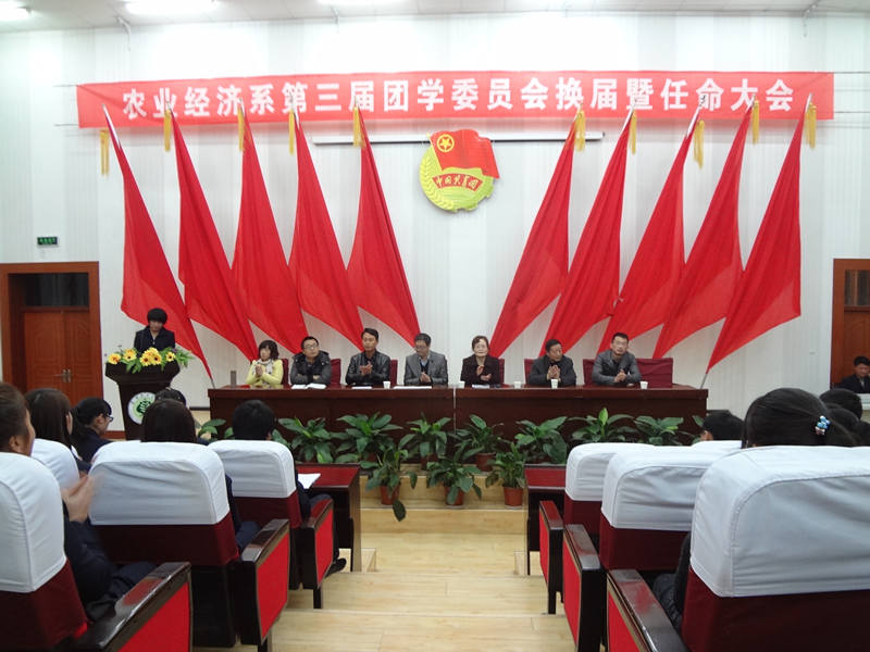 蔡飛介紹了學(xué)生會(huì)在學(xué)生工作中所起作用并對(duì)新一屆學(xué)生會(huì)提出了期望。同時(shí),宣布對(duì)農(nóng)業(yè)經(jīng)濟(jì)系第三屆團(tuán)學(xué)干部的任命。大會(huì)由第二屆學(xué)生會(huì)主席吳光宗做第二屆團(tuán)學(xué)會(huì)工作總結(jié),新當(dāng)選主席趙三桃代表新一屆團(tuán)學(xué)會(huì)宣誓。會(huì)上還對(duì)優(yōu)秀團(tuán)學(xué)干部進(jìn)行表彰。