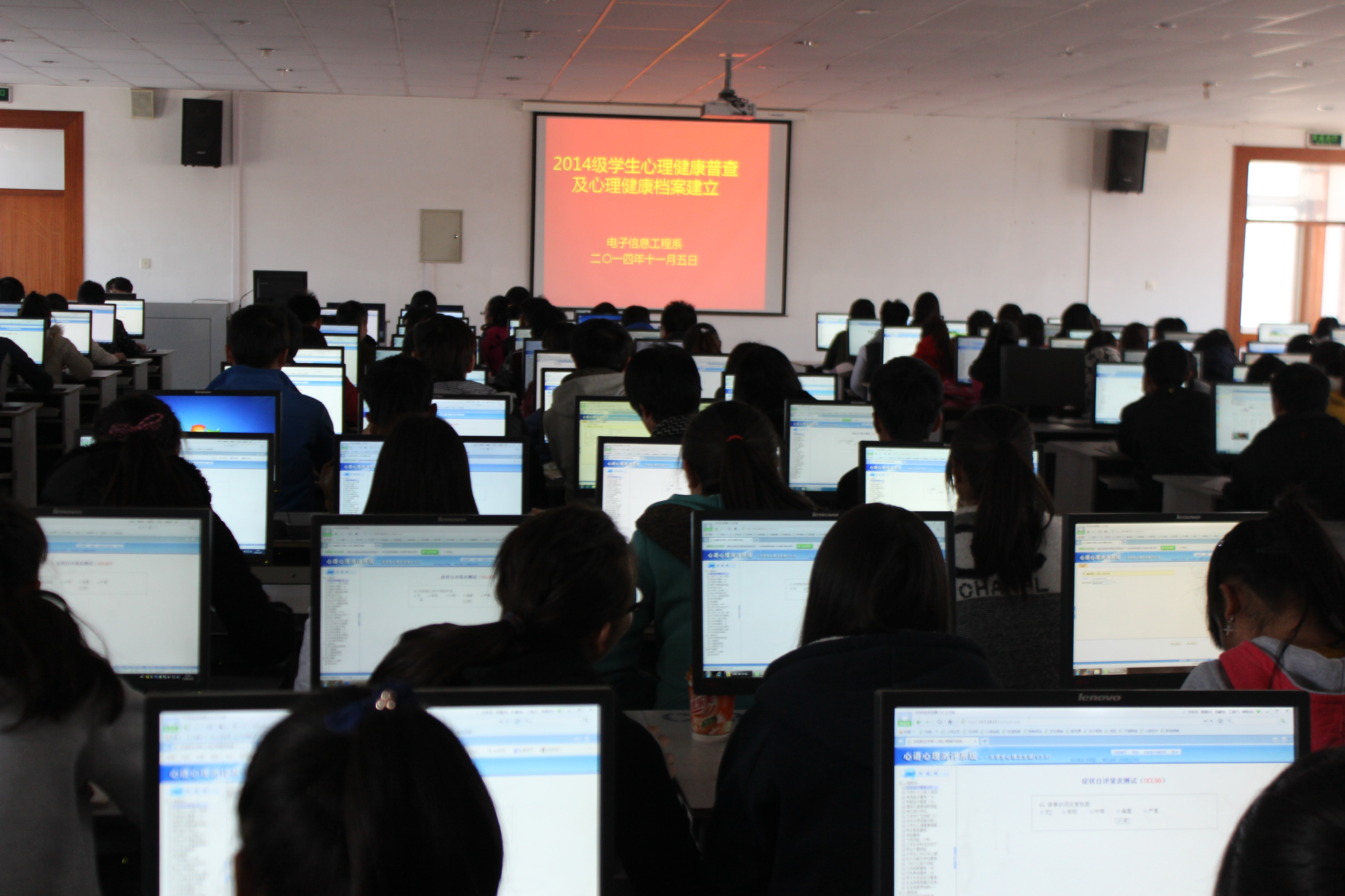 此次普查測試內(nèi)容包括:“癥狀自評量表(SCL-90)”、 “大學(xué)生心理健康調(diào)查表(UPI)”。測試中,同學(xué)們仔細(xì)作答,在指定時間內(nèi)完成了測試。