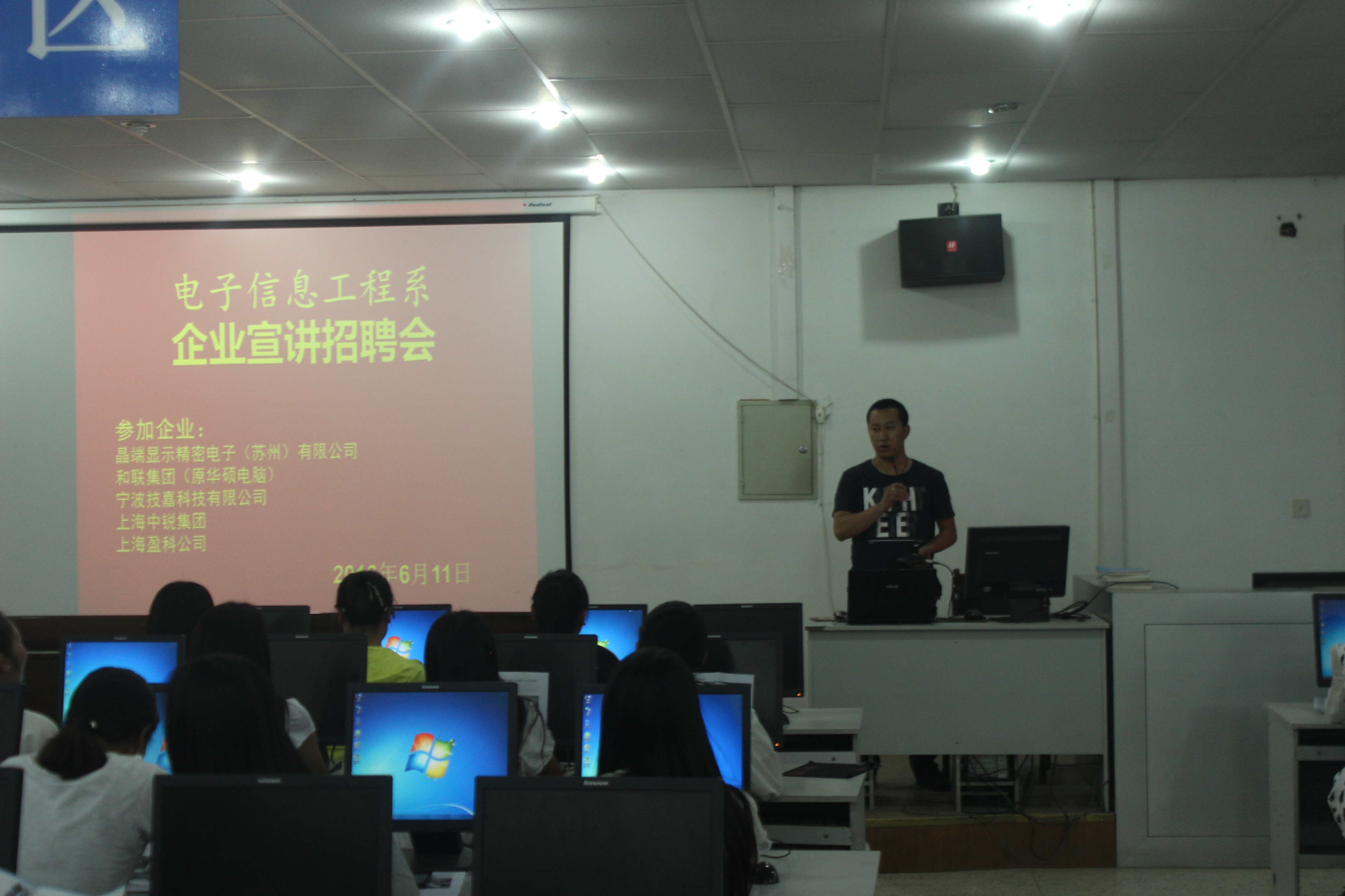 為更好的做好2014級學(xué)生頂崗實習(xí)的工作,6月11日,電子信息工程系在學(xué)院十號機房舉辦了企業(yè)專場招聘會,2014級全體學(xué)生參加了招聘會。參會的五家企業(yè)是:晶端顯示精密電子(蘇州)有限公司、上海中銳集團、寧波技嘉科技有限公司、和聯(lián)集團(原華碩電腦)和上海電訊盈科公司。