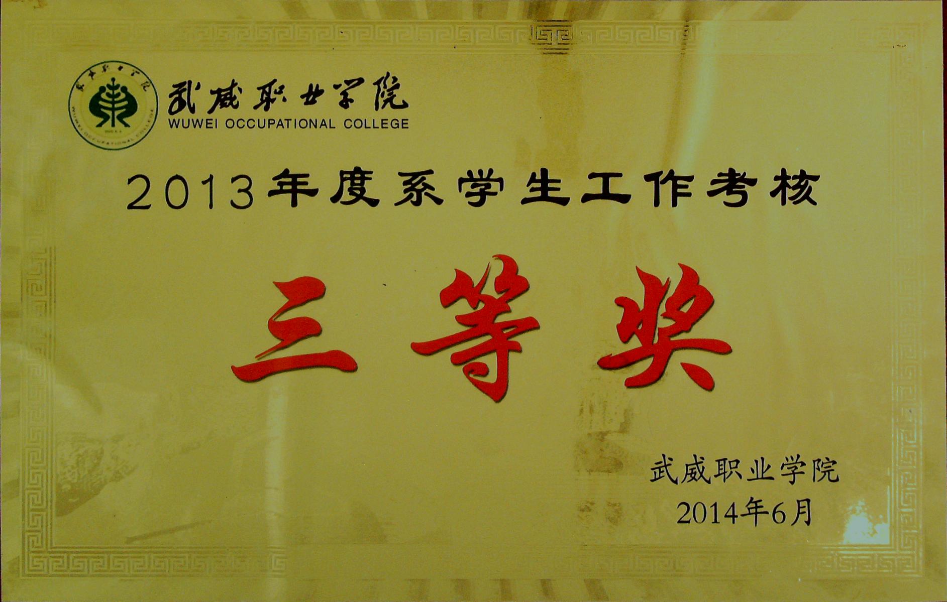 2013年度系學(xué)生工作考核三等獎(jiǎng)