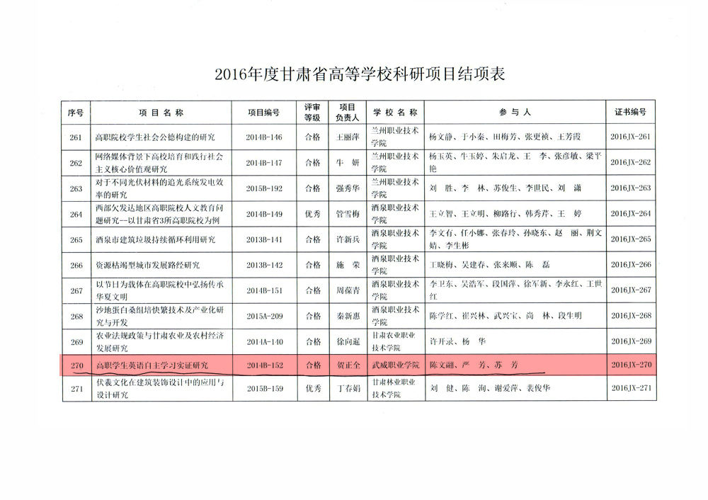 武威職業(yè)學院2020年-2024年科研項目獲獎一覽表