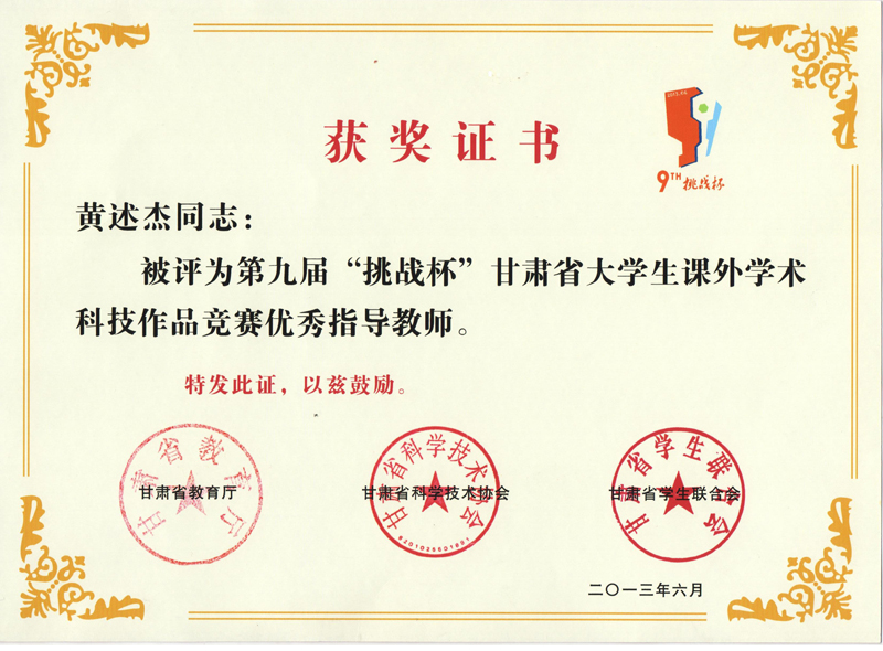 黃述杰榮獲第九屆“挑戰(zhàn)杯”甘肅省大學(xué)生課外學(xué)術(shù)科技作品競(jìng)賽優(yōu)秀指導(dǎo)教師