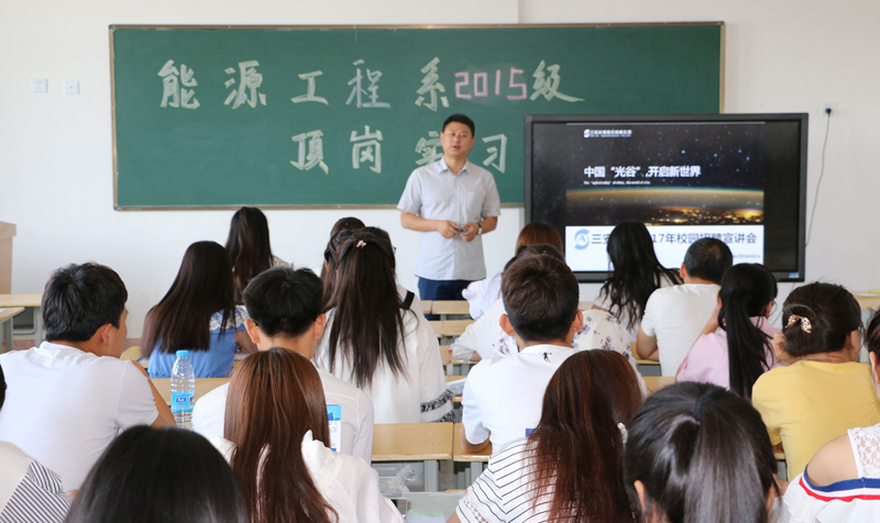 為進(jìn)一步深化校企合作,提供更優(yōu)質(zhì)的頂崗實(shí)習(xí)崗位,6月26日早上,能源工程系邀請校企合作企業(yè)安徽三安光電有限公司和晶科能源有限公司工作人員在我系洽談校企合作事宜,并對(duì)即將進(jìn)入實(shí)習(xí)的2015級(jí)學(xué)生做頂崗實(shí)習(xí)宣講。