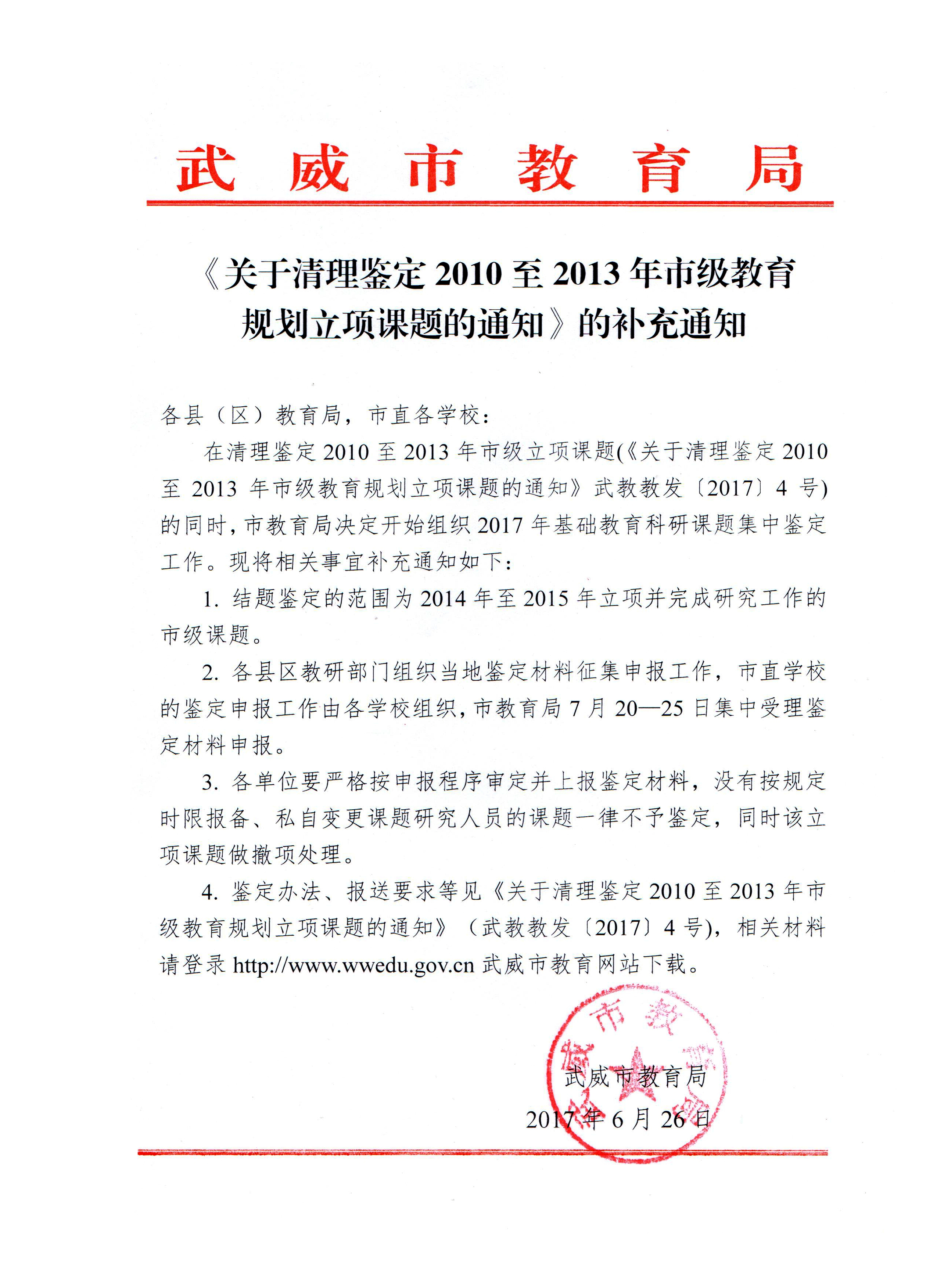 附:武威市教育局<《關(guān)于清理鑒定2010至2013年市級(jí)規(guī)劃立項(xiàng)課題的通知》的補(bǔ)充通知>
