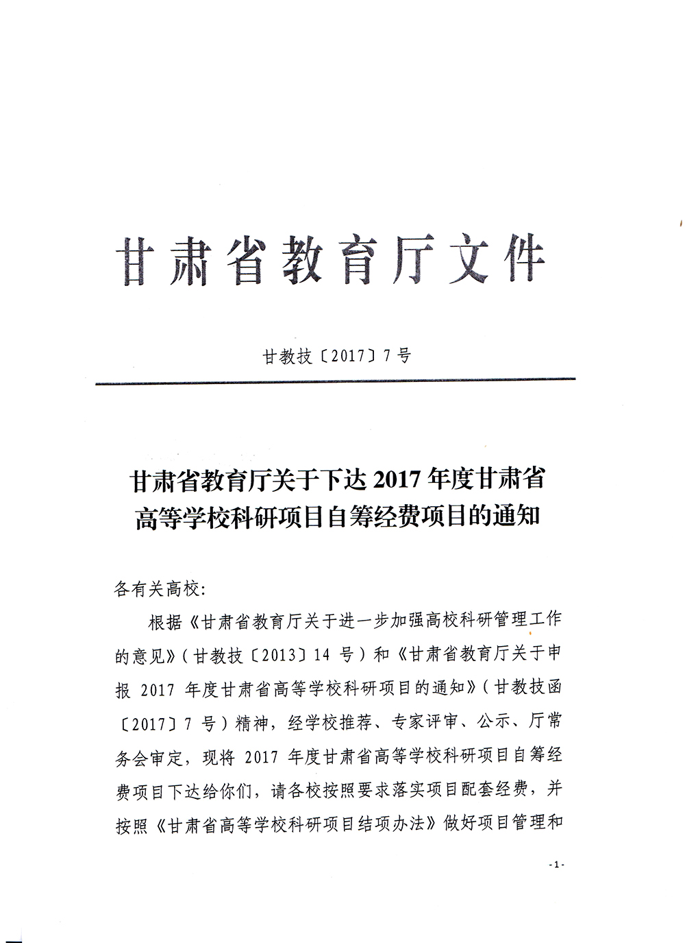 轉(zhuǎn)發(fā)甘肅省教育廳《關(guān)于下達(dá)2017年度甘肅省高等學(xué)校科研項(xiàng)目自籌經(jīng)費(fèi)項(xiàng)目的通知》