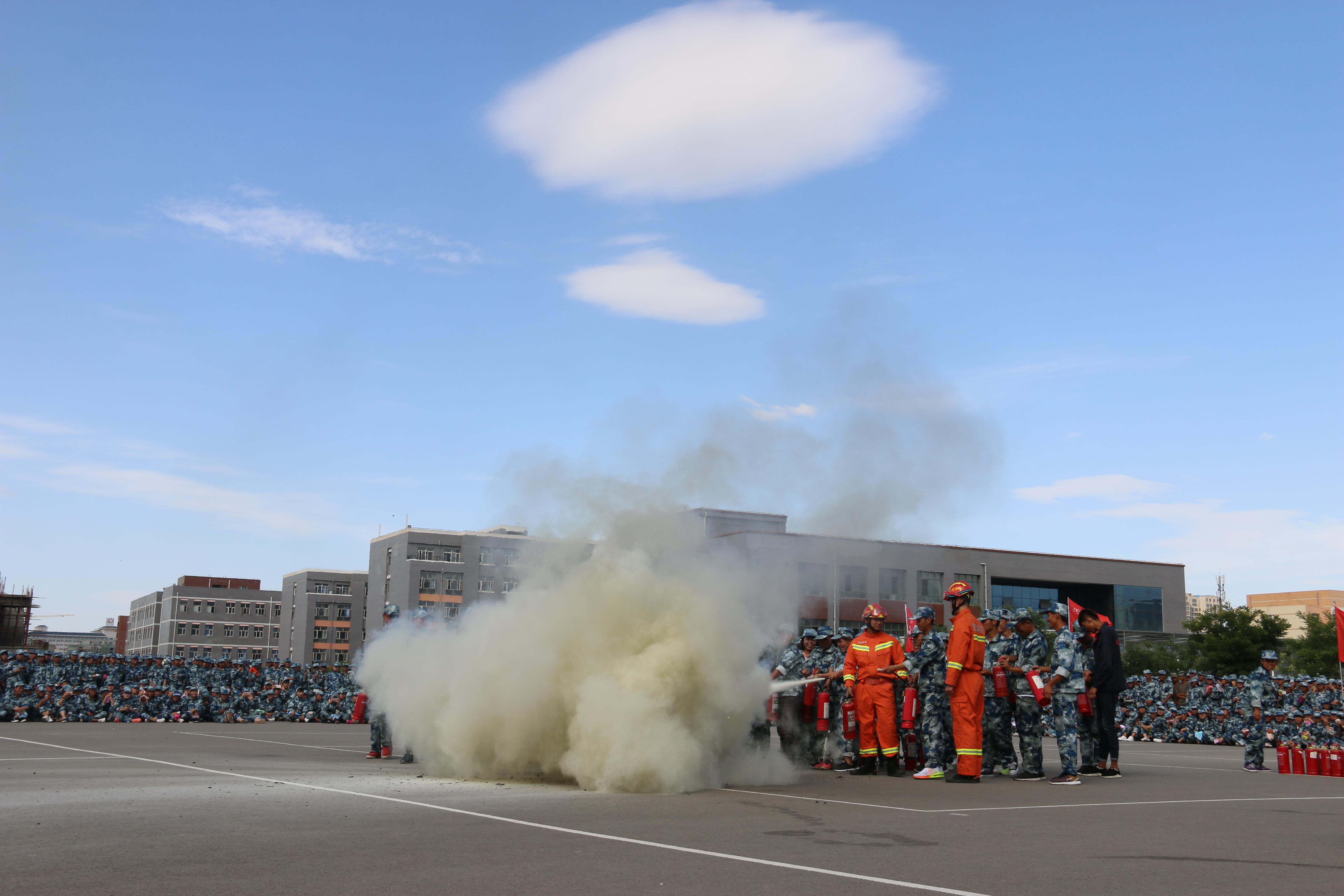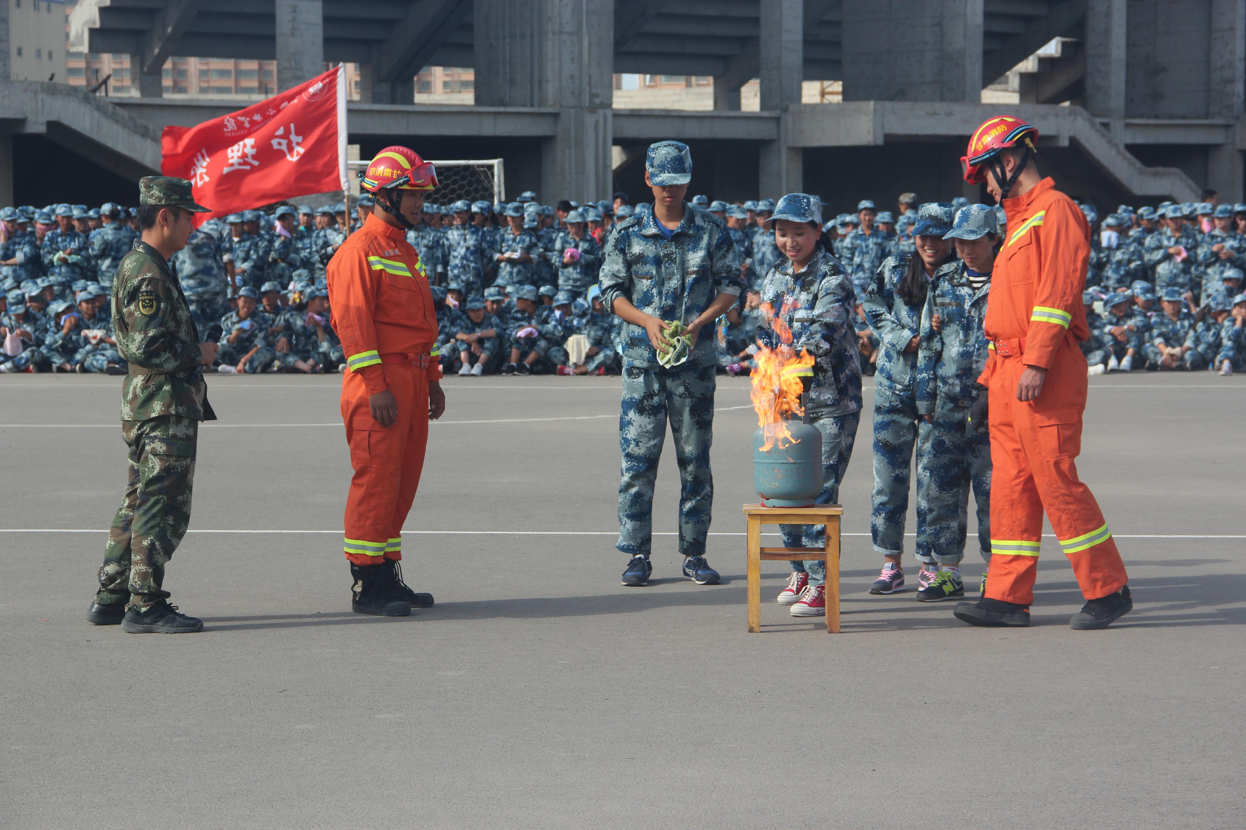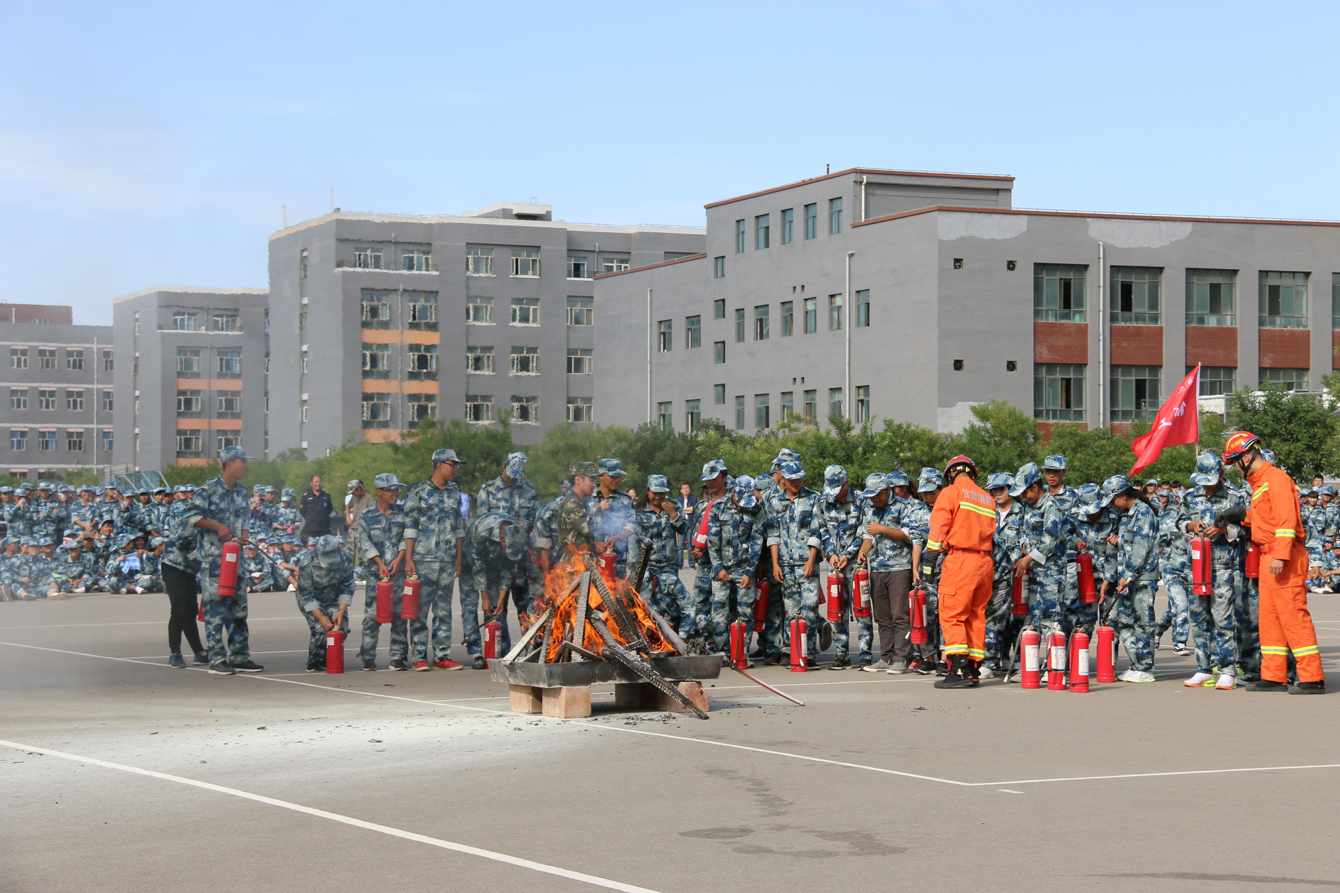隨后,所有參演學(xué)生整隊(duì)到操場(chǎng)參加了滅火演練。在消防官兵的講解和和示范下,同學(xué)們體驗(yàn)了處置著火液化氣瓶、干粉滅火器滅火,通過(guò)模型煙室等操作。