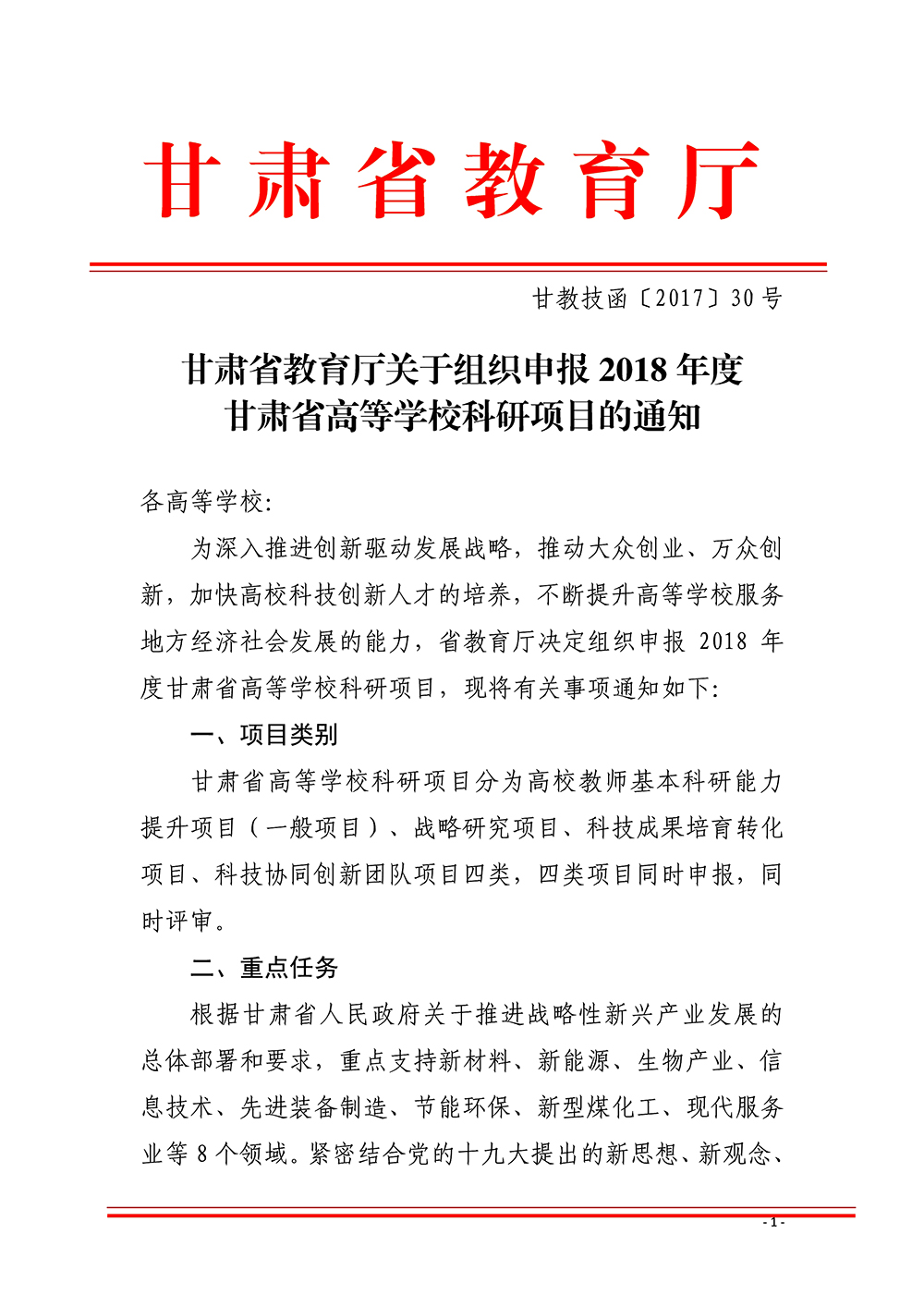 轉(zhuǎn)發(fā)甘肅省教育廳關(guān)于組織申報(bào)2018年度甘肅省高等學(xué)??蒲许?xiàng)目的通知