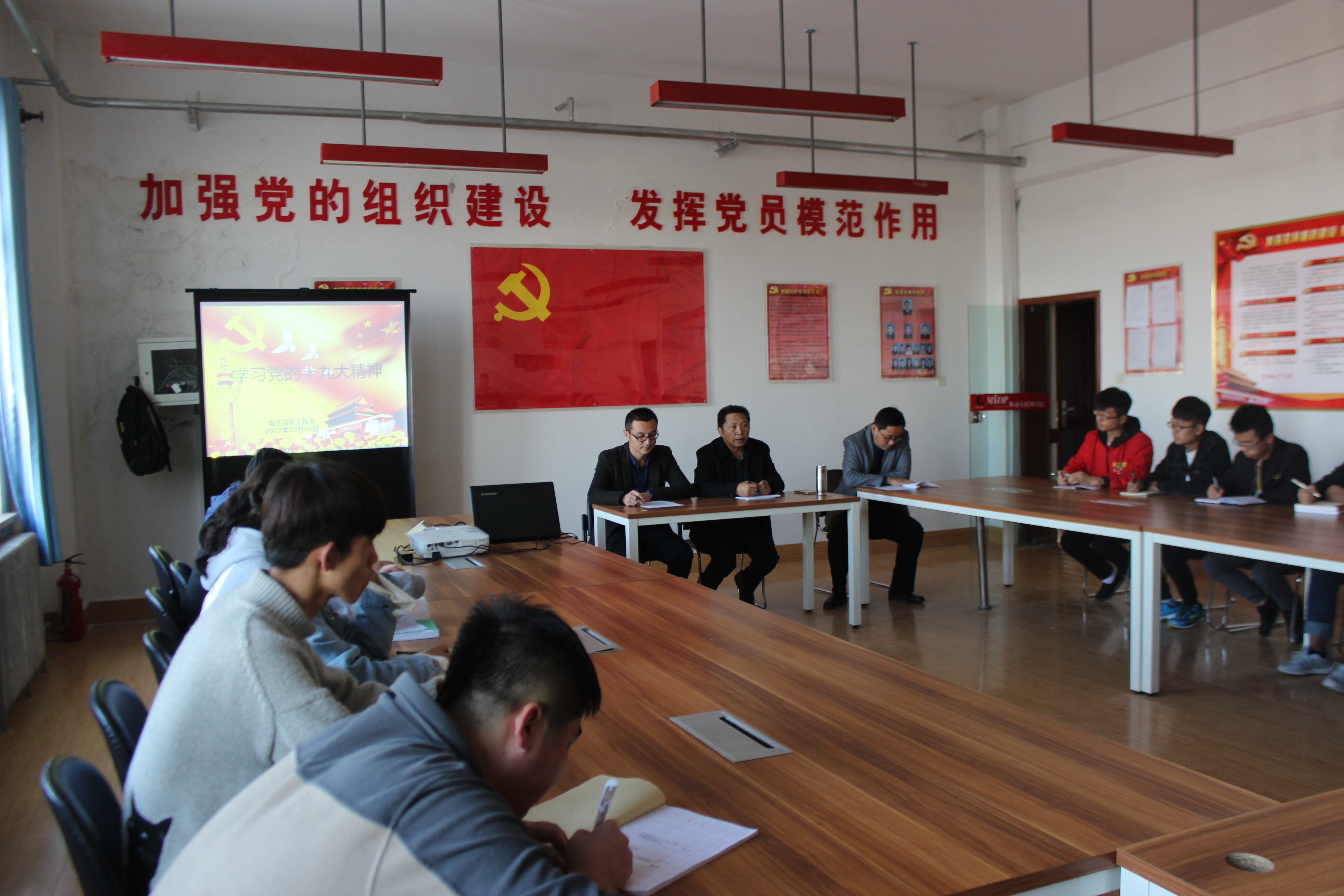 10月26日,電子信息工程系組織全體教師、學生干部在尚德樓黨員活動室集中學習黨的十九大報告和十九大會議精神。系黨總支書記袁青年主持學習會議。