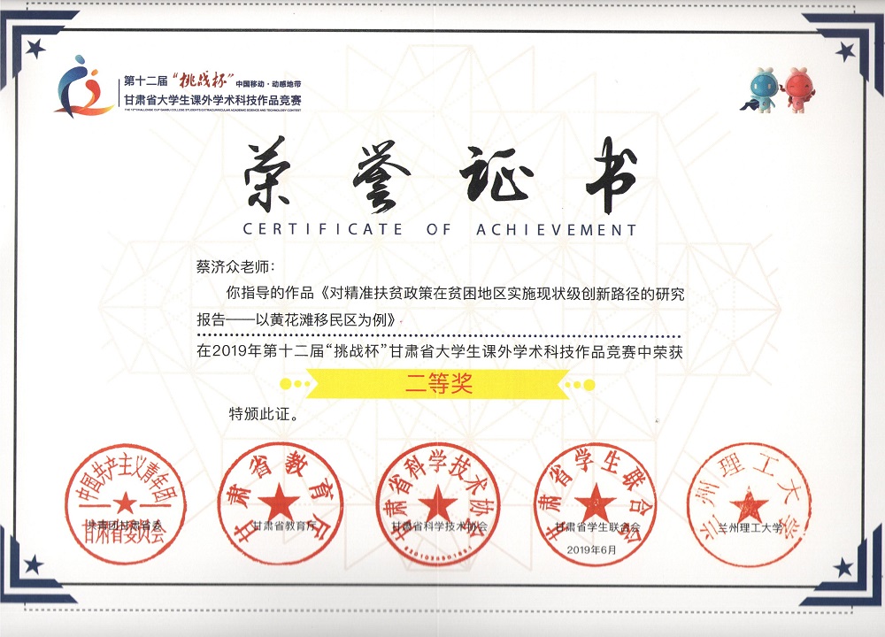 第十二屆“挑戰(zhàn)杯”甘肅省大學(xué)生課外學(xué)術(shù)科學(xué)作品《對(duì)精準(zhǔn)扶貧政策在貧困地區(qū)實(shí)施現(xiàn)狀級(jí)創(chuàng)新路徑的研究報(bào)告-以黃花灘移民為例》