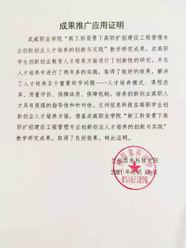 成果推廣應(yīng)用證明(武威職業(yè)學(xué)院建筑工程系)